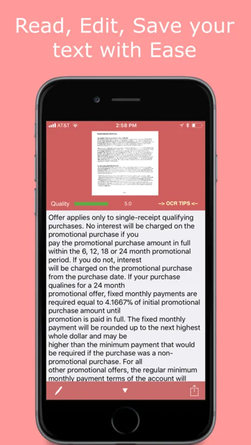 TIPS FOR OCR: • Make sure your document is flat and well lit. Hold your iPhone still while shooting. Turn the flash On (but beware of glare).