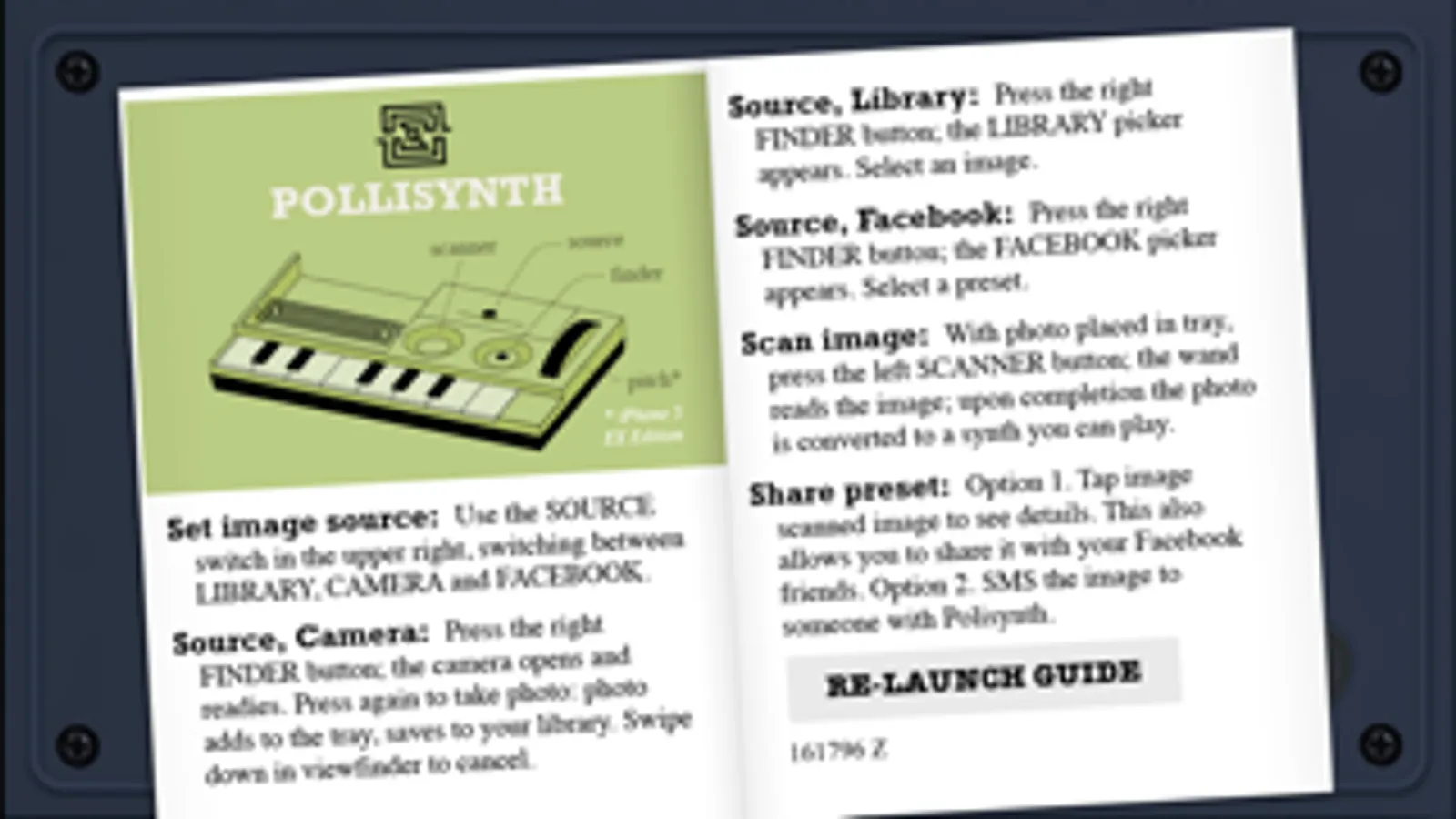 By logging into Facebook with Pollisynth you can post your sound-waves to your timeline as Presets. Your Facebook friends will be able to see and try out these Presets with their own Pollisynth and listen to your imagery. You can also re-download Presets you have uploaded and use Facebook as a Pollisynth sound bank online. For those who have reservations about Facebook, SMS and Email can be used to share images from your photo library that you know to generate worthy sounds. This works because the sounds are not random but entirely derived from the image, so rescanning an image will always result in the same sound so long as it hasn't been manipulated. Your photo library will always serve as your offline sound bank.