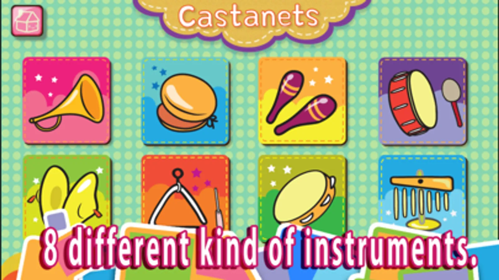 The 'Instrument Cards' will give kids chance to experience several kinds of instruments. Great animation and realistic instrument tones would be good for eyes and ears! A wonderful chance for you to teach your kids the name of the instruments. Brass, castanets, maracas, drum, cymbals, triangle, tambourine, and wind chime.