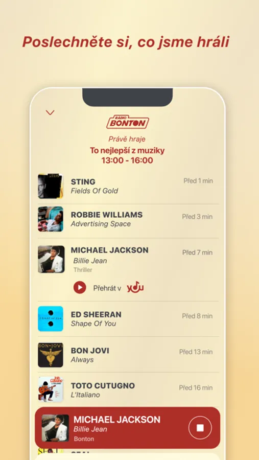 Nalaďte si Rádio Bonton prostřednictvím aplikace a poslouchejte nás kdekoliv v nejvyšší kvalitě zdarma. Spusťte si živé vysílání, vyberte jedno z našich tematických rádií a připomeňte si nejoblíbenější hity vašeho mládí.