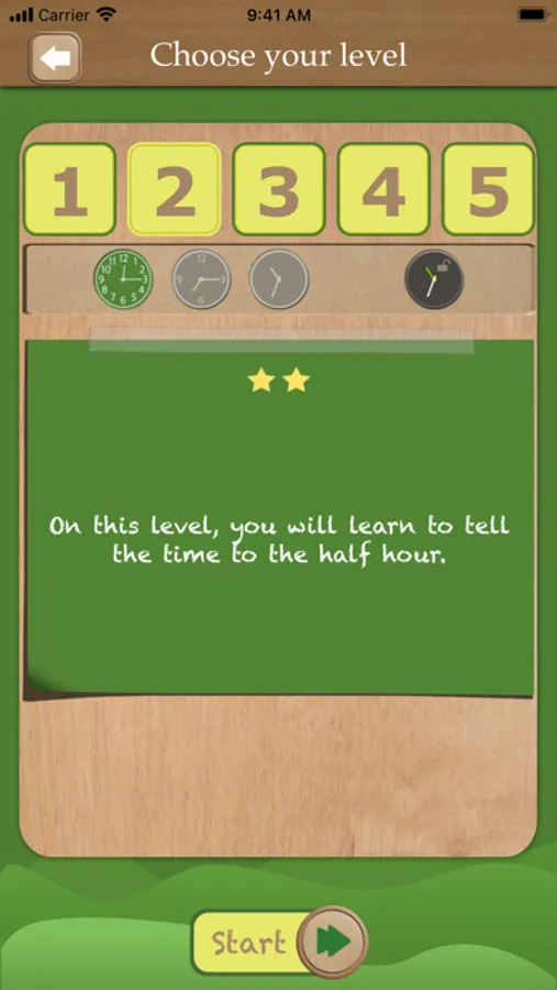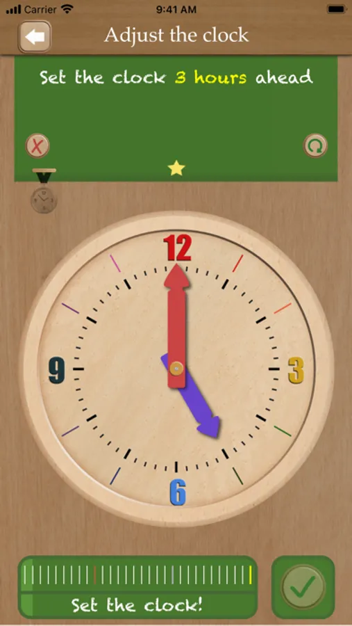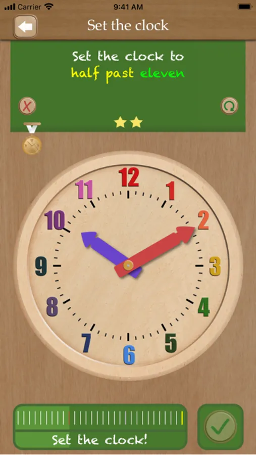 You can practice together with your child, or let him/her perform assignments on his/her own using the nine game types in the App: "Set the clock’, ‘Tell the time’, ‘Adjust the clock’ and more. The assignments are clearly pronounced in English.