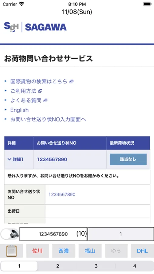 追跡番号・伝票番号を入力して会社名を選択するだけで簡単に配達状況を検索・確認できるシンプルな無料宅配便荷物追跡アプリ。追跡番号とメモは自動保存、登録4件を切り替え可能。今日の日付と曜日表示、追跡番号ペースト機能、追跡番号入力時の数字読み上げ機能。佐川急便(飛脚)/西濃運輸(カンガルー)/ヤマト運輸(クロネコヤマト宅急便)/日本郵便局(ゆうパック・レターパック・クリックポスト・書留・書き留め・特定記録)/EMS(China Postなど)/DHL/福山通運、対応。