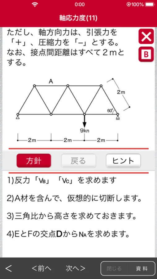 ・構造計算は、「方針」ボタンで解くための手順が表示されます。
