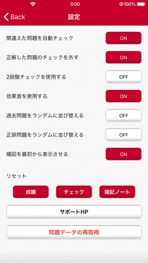 (自動チェック、ランダム、補図のON・OFF、成績リセット等)
