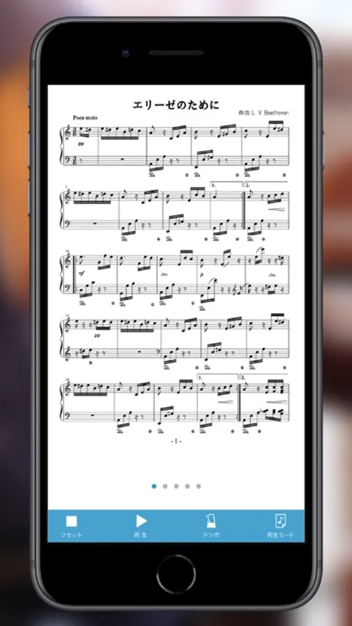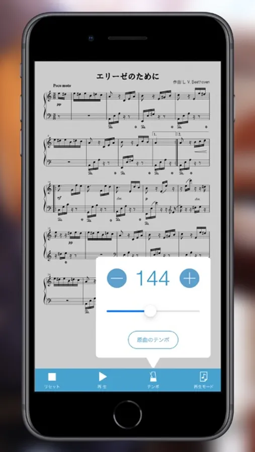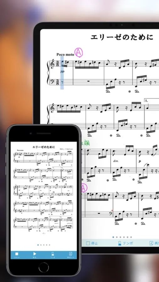 App plays the music (playing sound of piano) which is synchronized with the note on the score. It is a convenient function for practicing on trains. Can freely change where to play or how fast to play.