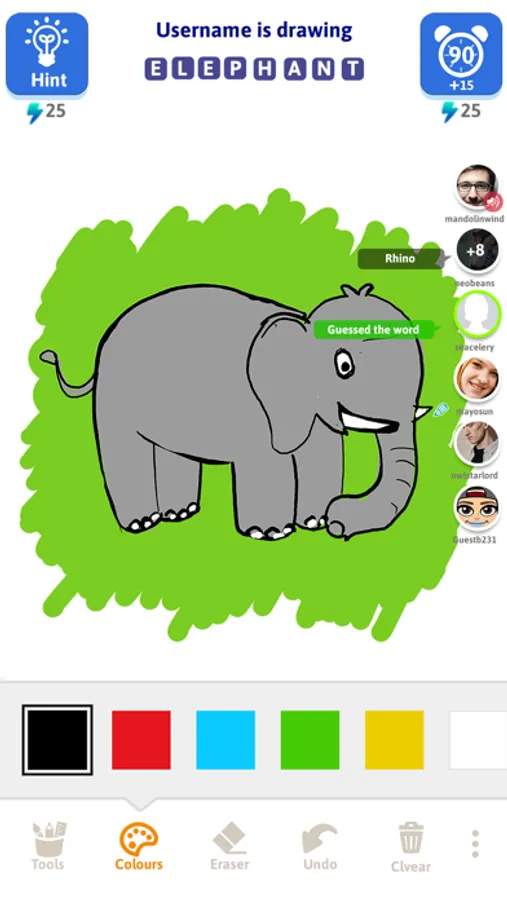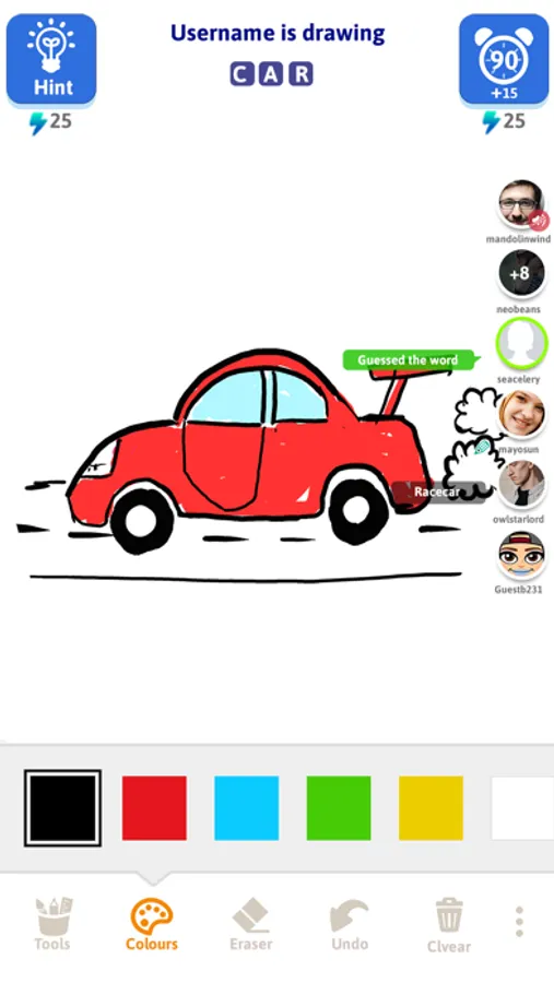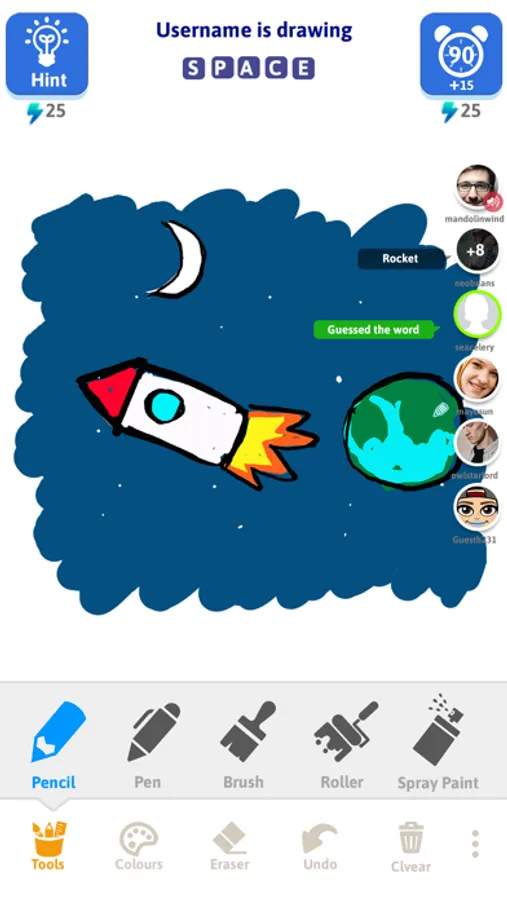 The fun begins here! If it’s your turn to Draw, start drawing pretty pictures for the given word. If it’s your turn to Guess, start making funny guesses. Beware!!! To win a round, you need to be the first one to guess the word. So hold on tight and start making guesses!
