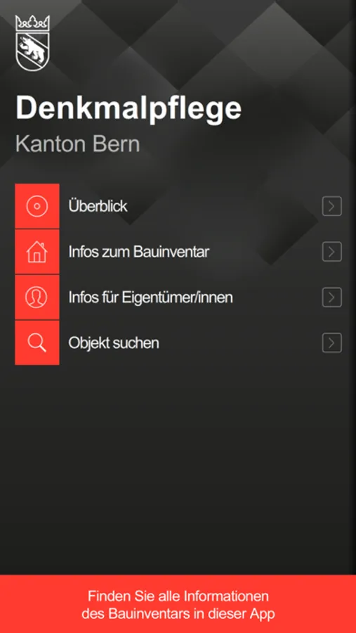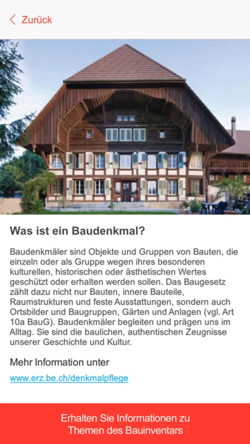 Die App Denkmalpflege des Kantons Bern, Schweiz erschliesst die Daten des kantonalen Bauinventars. Die Baudenkmäler des Kantons Bern sind in einem Inventar erfasst, beschrieben und bewertet. Baudenkmäler begleiten und prägen uns im Alltag. Sie sind die baulichen, authentischen Zeugnisse unserer Geschichte und Kultur. Es ist der Auftrag der Denkmalpflege, sich um unser bauliches Erbe zu kümmern und die besonderen Werte und Qualitäten von Baudenkmälern zu vermitteln.