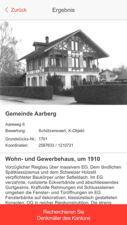 Die App Denkmalpflege des Kantons Bern, Schweiz ermöglicht die einfache und gezielte Suche im Bauinventar. Die Suche erfolgt nach Gemeinden oder Adressen. Die einzelnen Baudenkmäler sind mit einem Foto illustriert, dazu erläutert ein Kurztext die besonderen Qualitäten des Objekts sowie seine Bewertung. Auch die Lokalisierung der Baudenkmäler auf einer Karte gehört zum Angebot. In einem übersichtlichen Menu liefert die App Denkmalpflege des Kantons Bern, Schweiz wichtige Hintergrundinformationen zum Inventar, zur Bewertung der Baudenkmäler sowie spezifische Informationen für Eigentümer und Eigentümerinnen von Baudenkmälern.