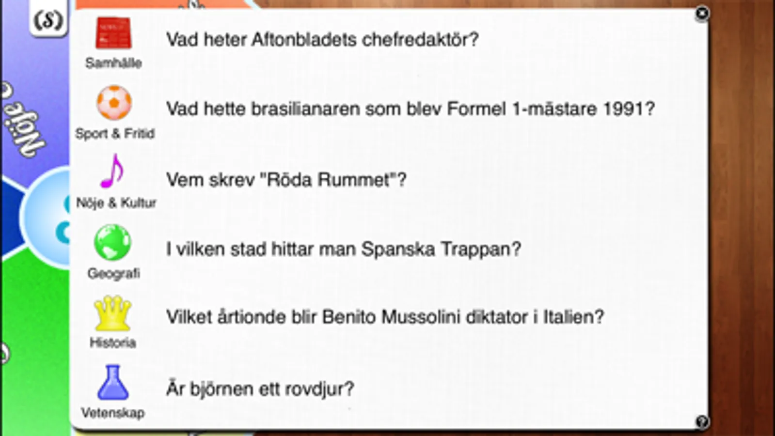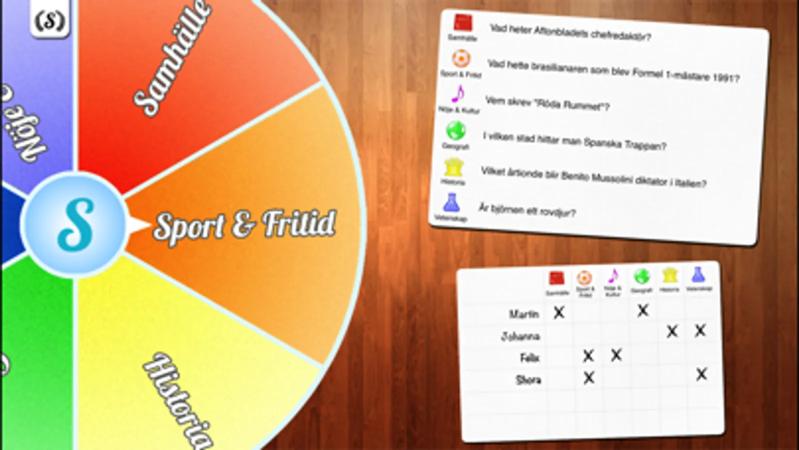 ***** Frågehjul med sex kategorier (Samhälle, Sport/Fritid, Nöje/Kultur, Historia, Geografi, Vetenskap)