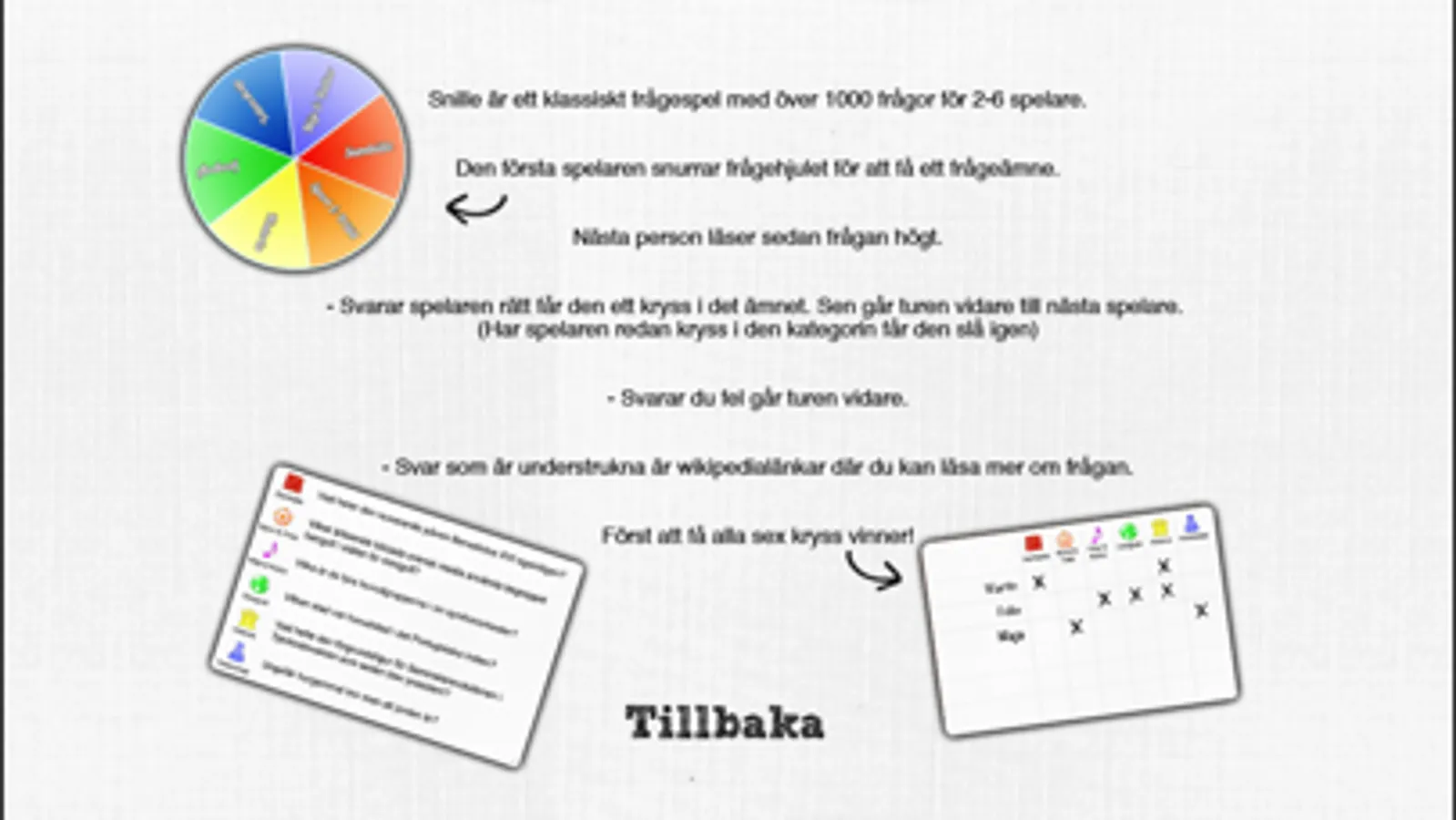 SNILLE är gjort för 2-6 spelare. Styr spelet själv, och turas om att läsa frågor för varandra. Snurra hjulet, dra med fingret för att vända på frågekortet och sätt själva poängkryss på poängkortet. Dela dina segrar på Twitter och Facebook!