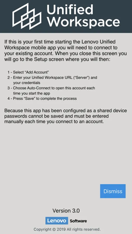 To get started you’ll need your organization’s Unified Workspace URL (for example, access.mycompany.com) and the username and password that you use.