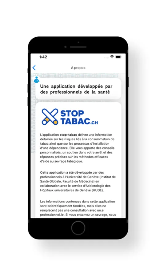Développée par des experts de l'arrêt du tabac de l'Université de Genève, elle vous propose gratuitement des conseils personnalisés pour votre sevrage de nicotine.