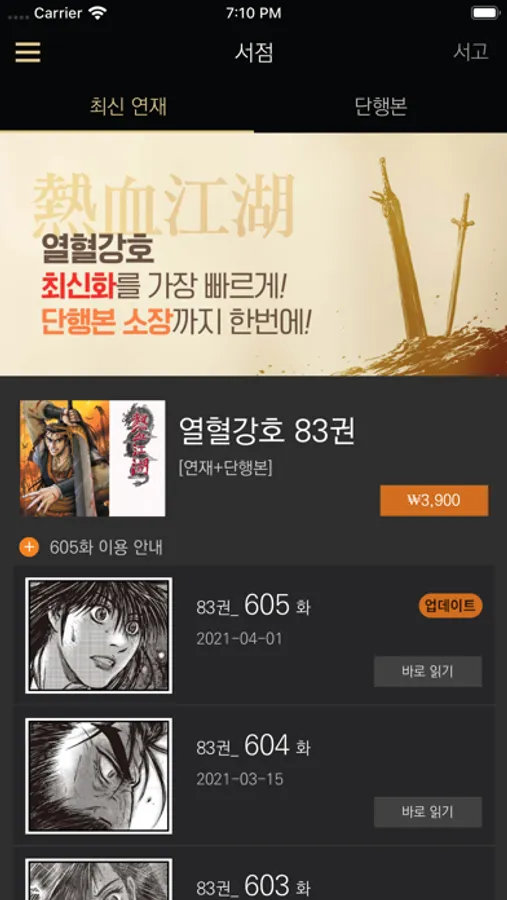 최신 연재 메뉴에서 최신화 바로보기와 단행본 소장을 한 번에!