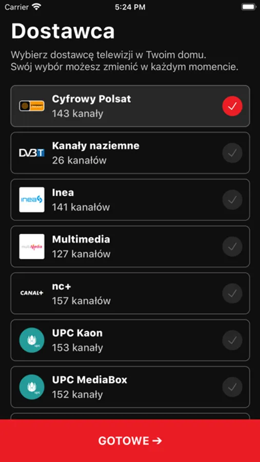 • Dostosowanie wg dostawcy – aplikacja dostosowuje listę kanałów do posiadanego dostawcy (NC+, Cyfrowy Polsat, Inea, UPC, Vectra, Multimedia, Telewizja naziemna)