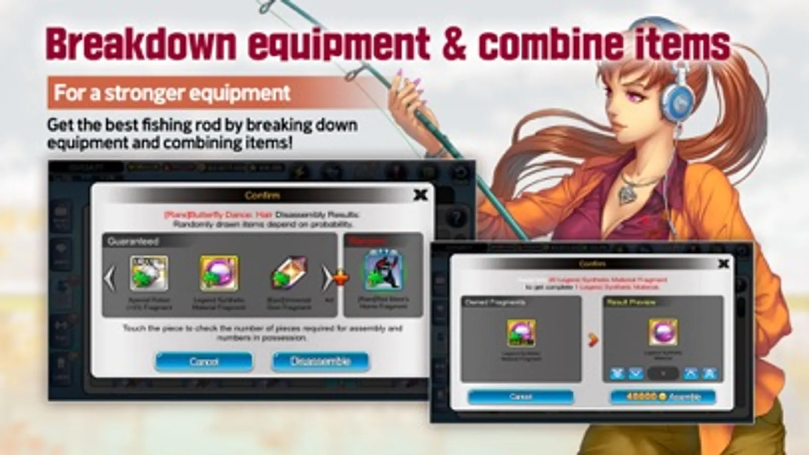 - Acquire better fishing rods and rare items by adding the pieces from breaking down your fishing rod!
