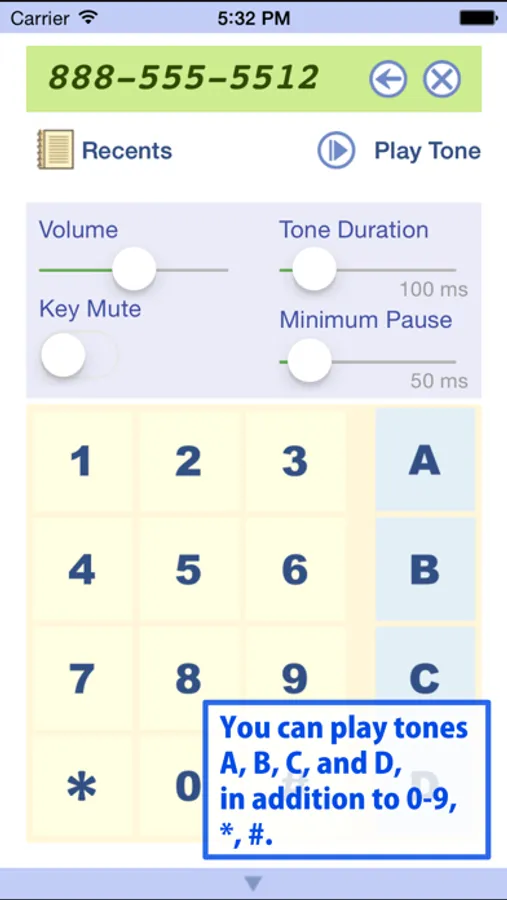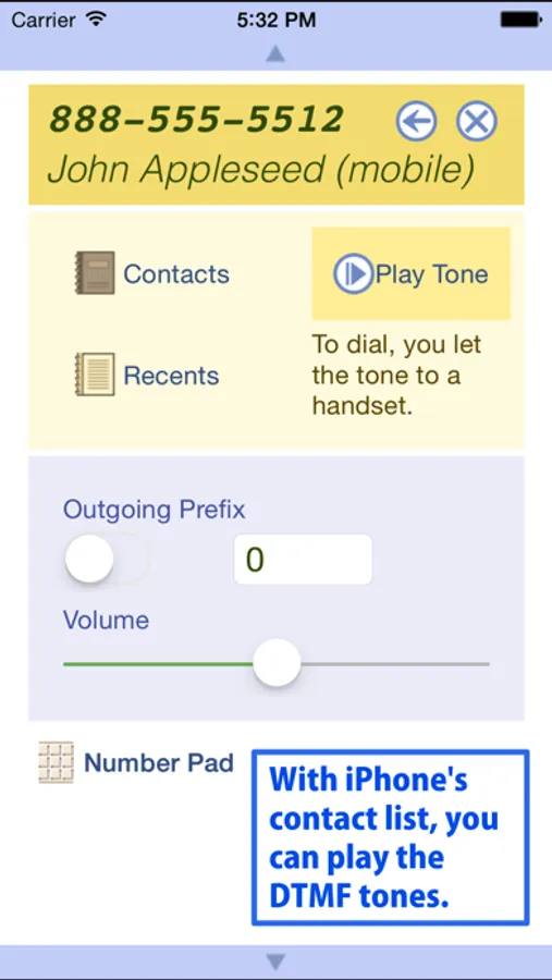 Using iPhone's contact list or This app's Recents list, play back DTMF tones.