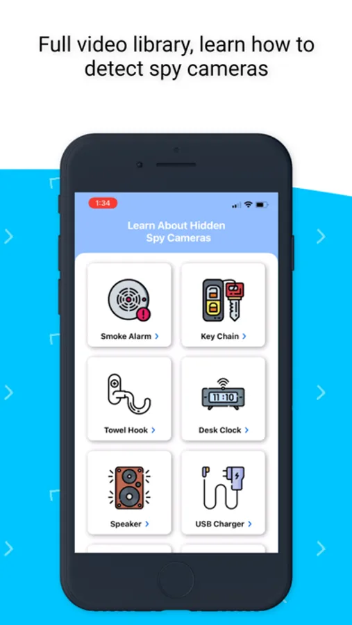 Scan any room for hidden spy cameras and make sure no one is spying on you! Red crosshairs target any suspected camera right on your screen.
