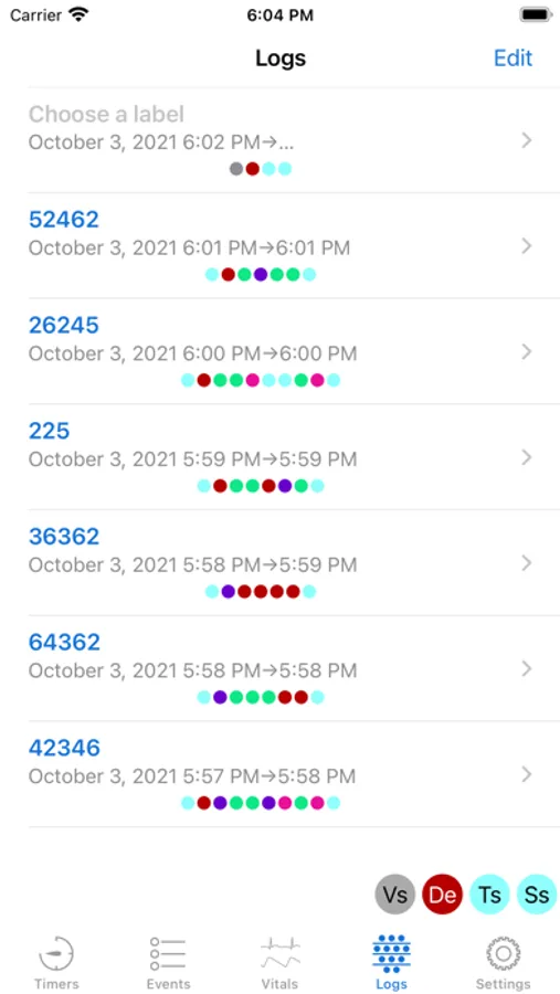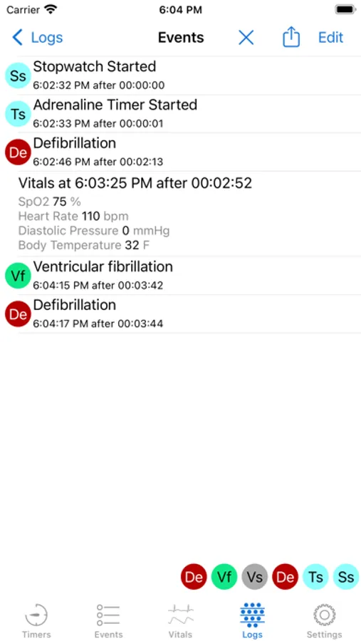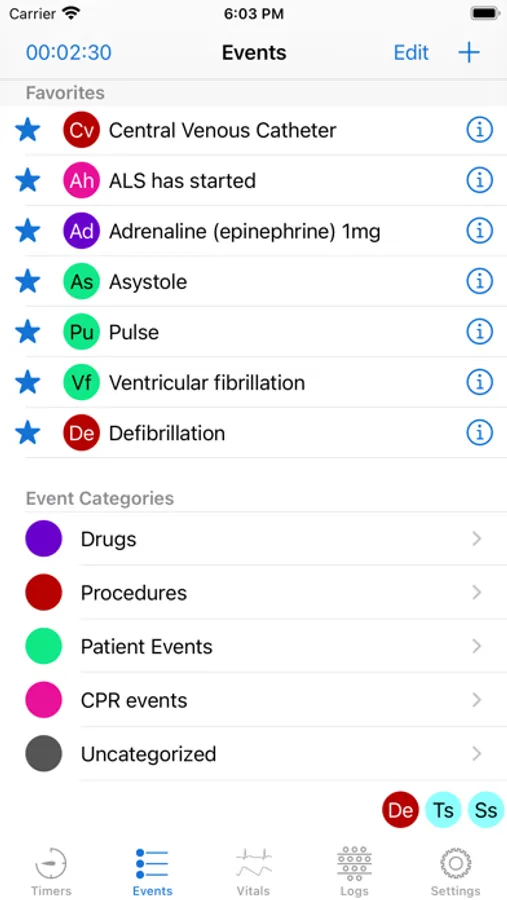 • Easy to use event logging. The app comes with around 100 events in several predefined categories (drugs, procedures and other events), with the possibility of adding many more. These can marked as favorites for easy selection, or searched for by name and category.