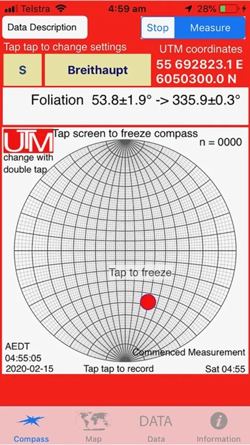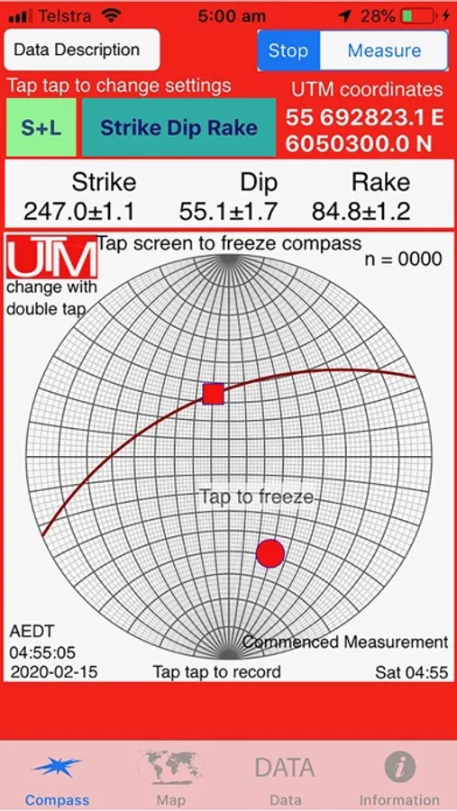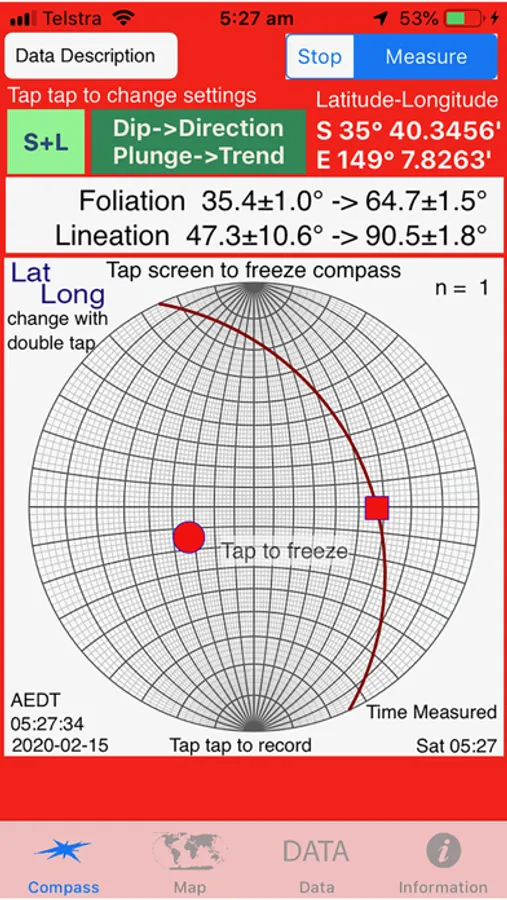 The compass readily allows measurement of foliations and lineations, records the information, and allows placemark pins to be dropped on a map to record traverse information. It is designed by a professional structural geologist, and takes into account practical issues: i) measuring upside down under overhangs; ii) measures lineations separately, or foliations, or all together (tap tap on the display to change); iii) allows on the fly data descriptions to be logged; iv) allows export of data, including a KML file that can be dragged onto GoogleEarth to record placemark locations.