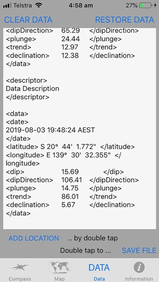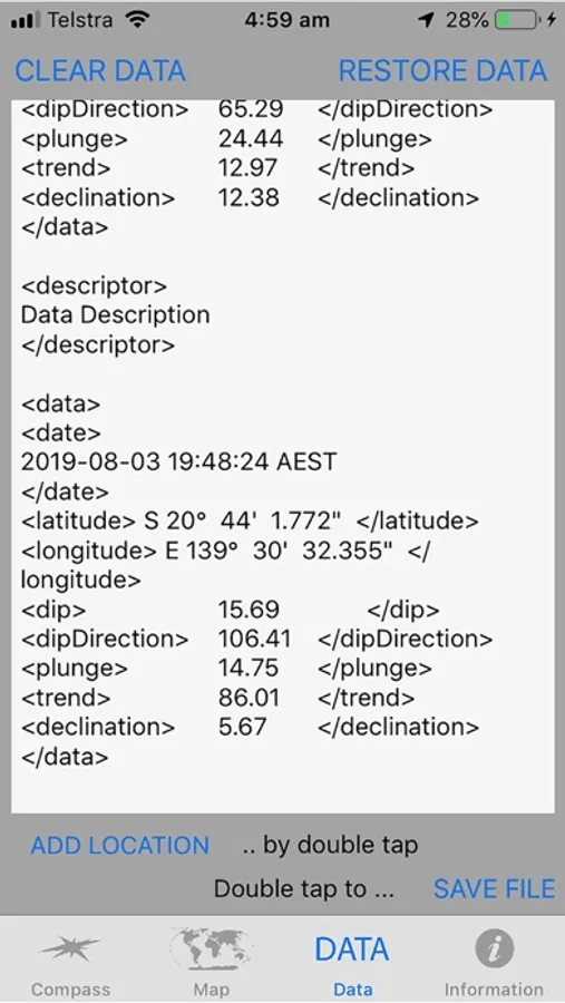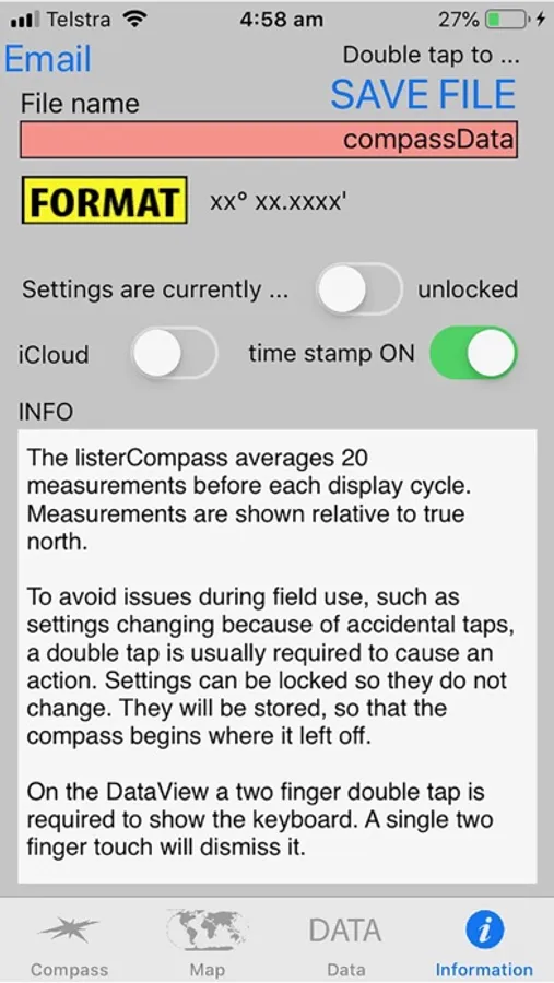 Records data in a variety of different formats: i) UTM; ii) latitude-longitude. Double tap on the display screen to change. Toggle between the compass screen, the data display, and the map. Autosaves your data and allows export via email, or using iTunes.