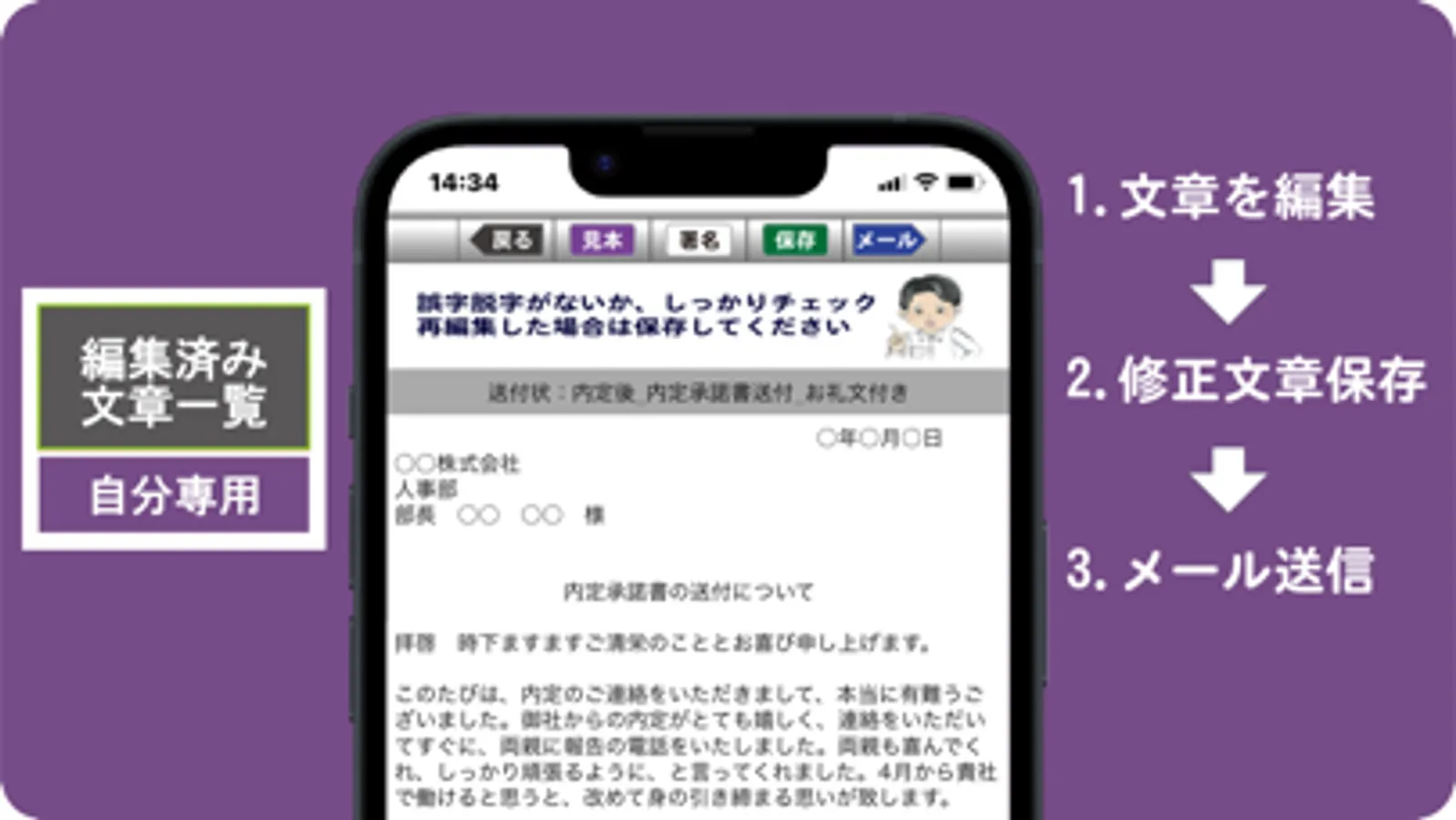 推薦状、送付状、メール署名、問合せを、テンプレートから自分用に編集したり、メールに送ったりすることができます。