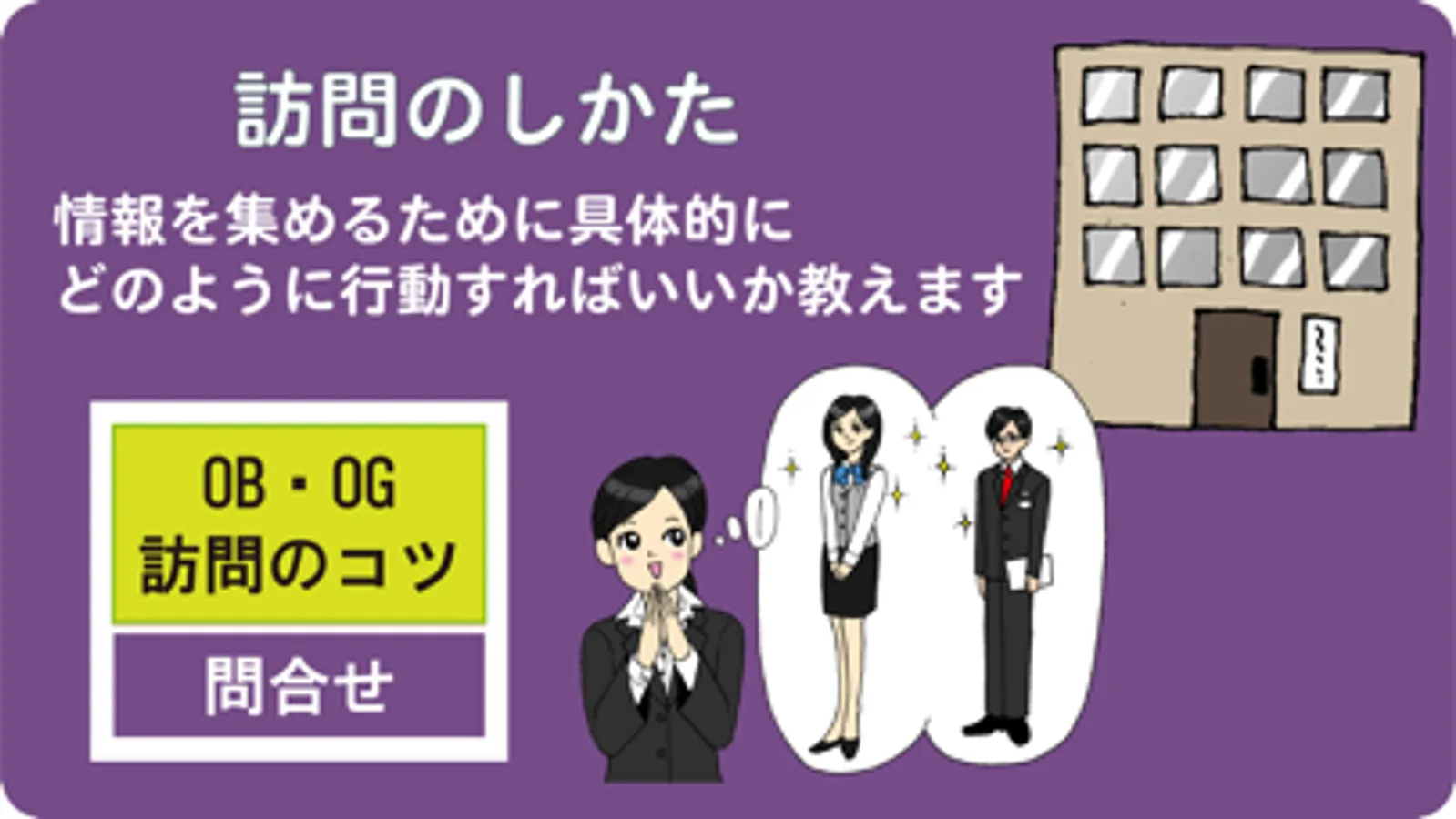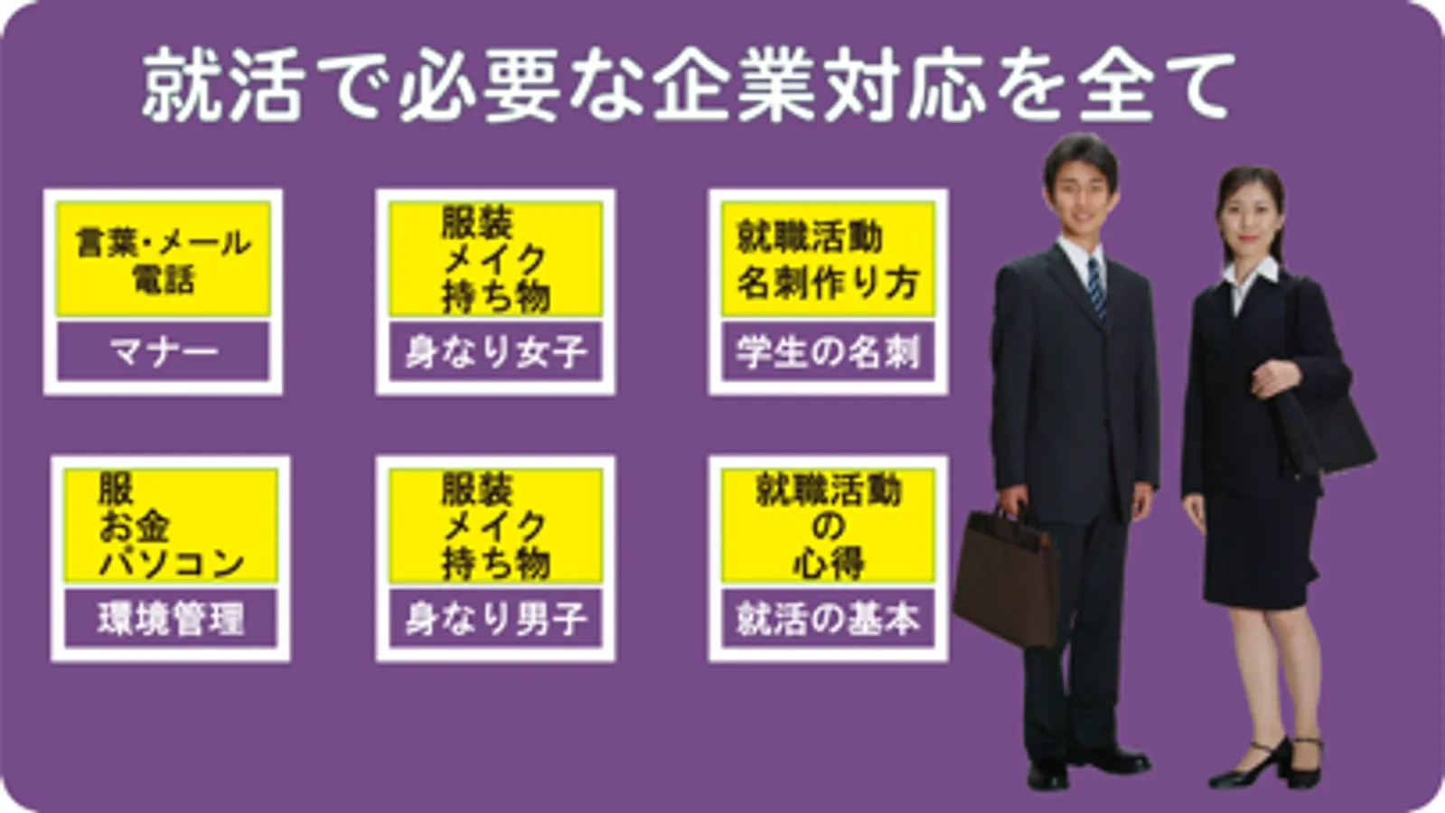 電話、メール、送付状、名刺、OB訪問メイク、持ち物まで、就職活動で企業と接するあらゆる場面を想定して対応策を教えます。