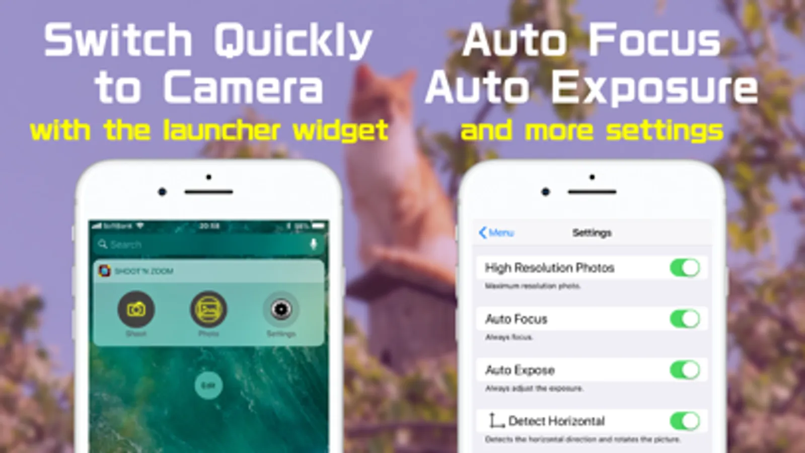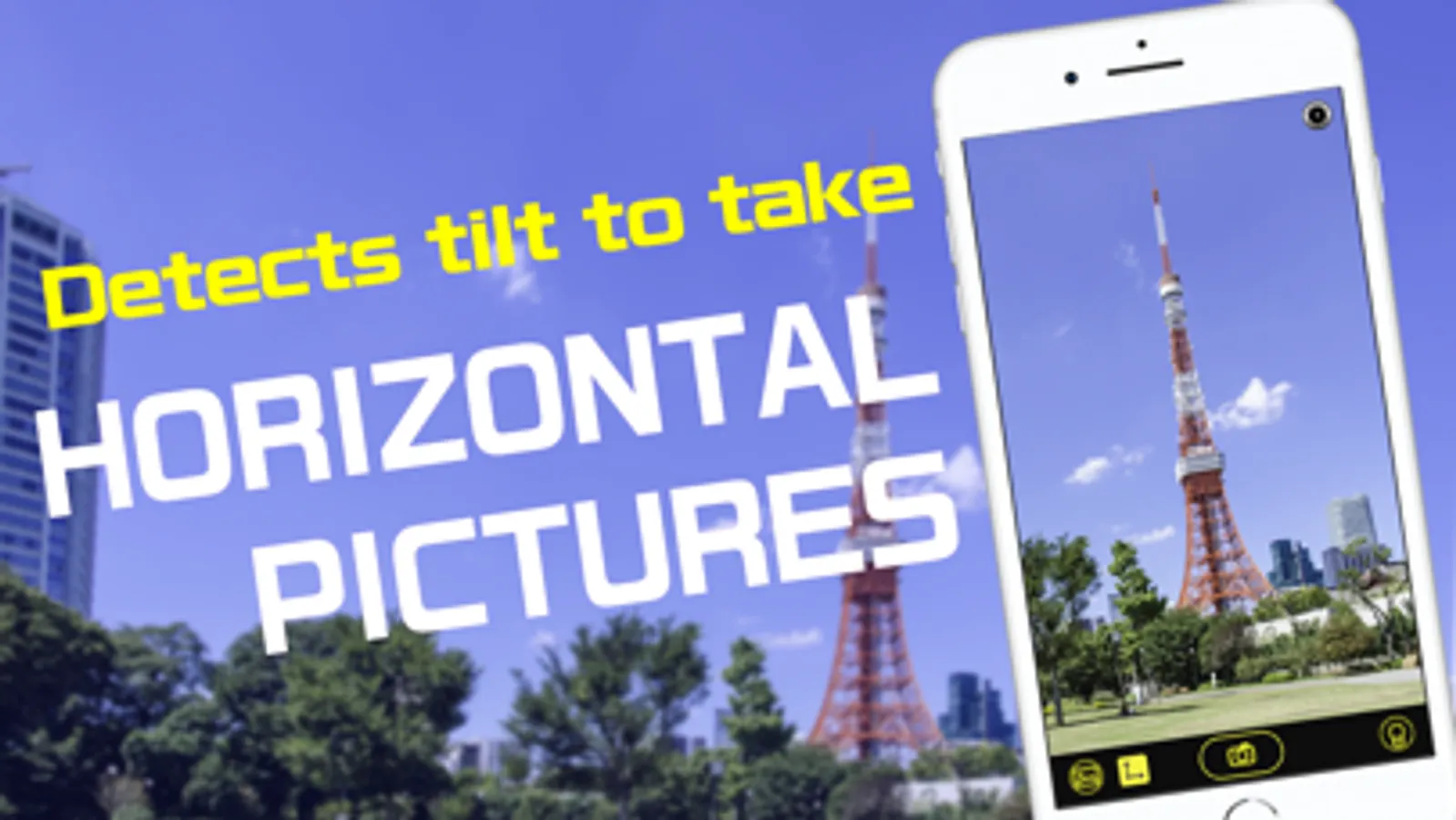 To take natural photos, keeping the horizontal direction is important. Shoot'n Zoom will do it automatically. This app detects the horizontal direction from the tilt of the device during shooting and rotates the photo to be exactly horizontal.