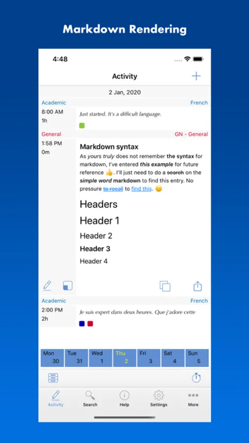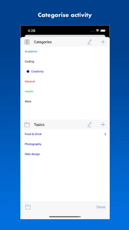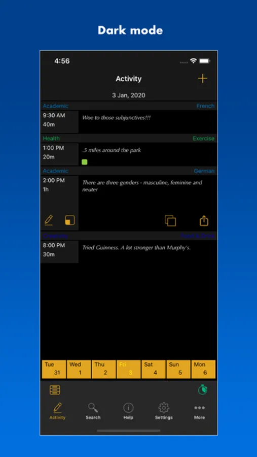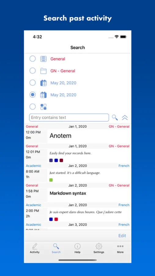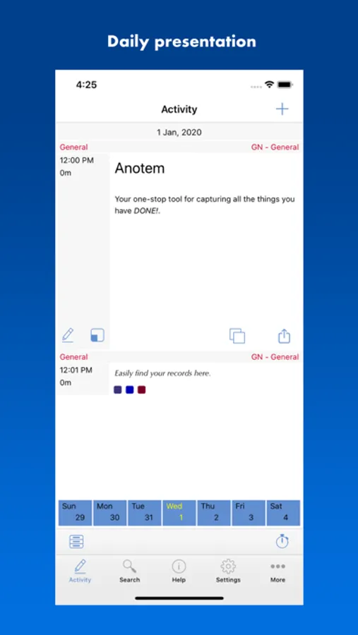 Anotem is your tool for capturing those "I'VE FINISHED" moments. Achieved something at work? Mastered something in your leisure time? Then use Anotem to capture those great moments. Use it to keep a record of major events (running a marathon), repeating events (learning French) or random events (just seen a great film or found some inspirational quotes). You choose how to use Anotem... and keep those records forever.