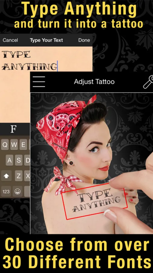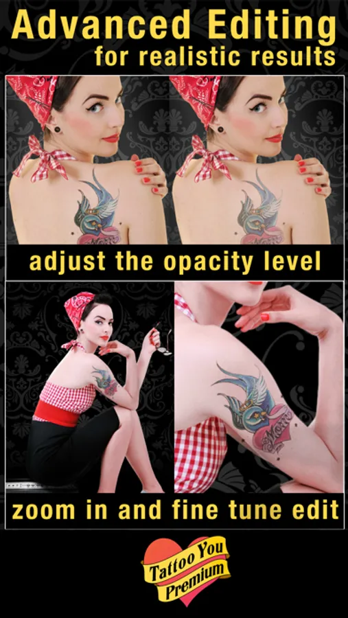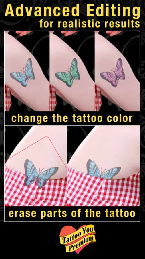 The premium tattoo app to add tattoos to your photos with no in app purchases required. See what that tattoo would look like before you commit or prank mom and dad. Download Tattoo You and add some spice into any of your mobile photos by adding in virtual tattoos with the click of a button right now!