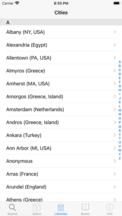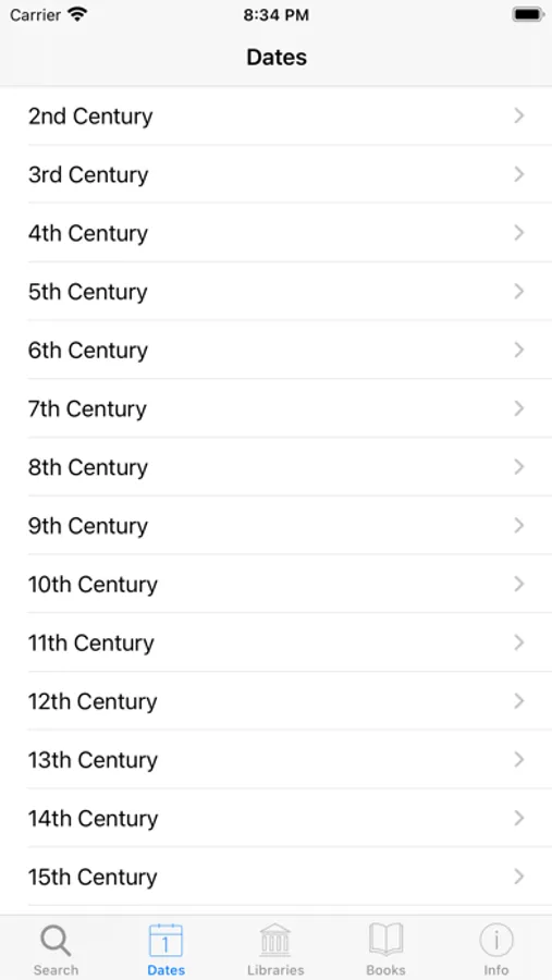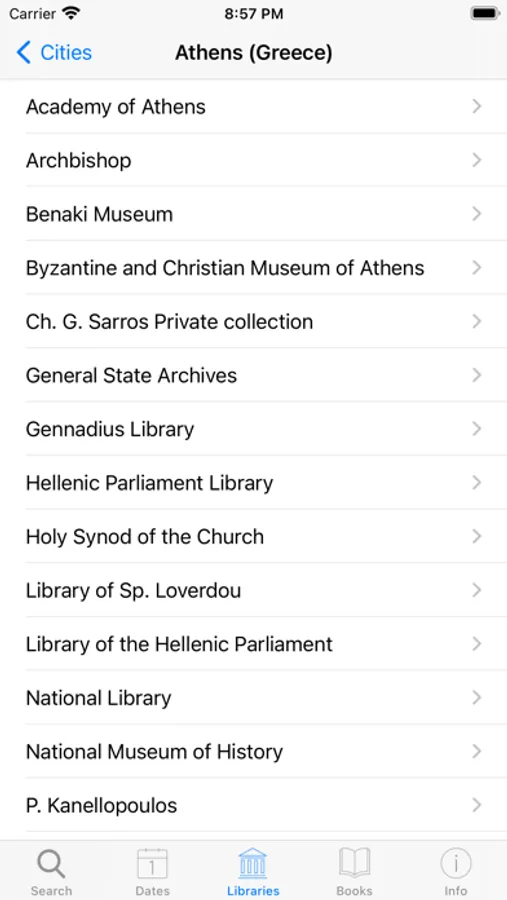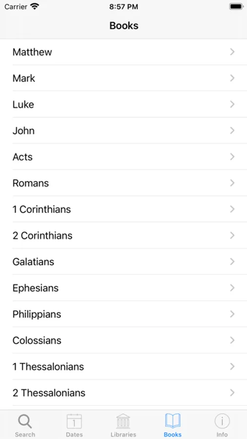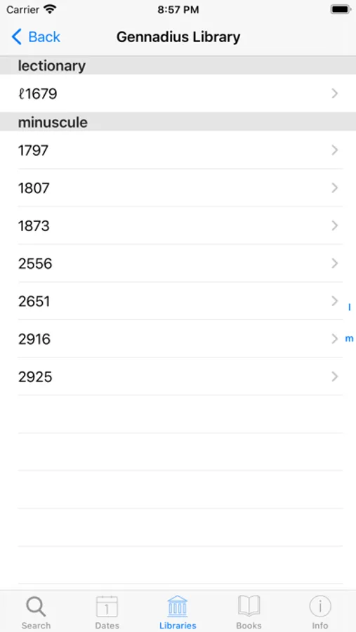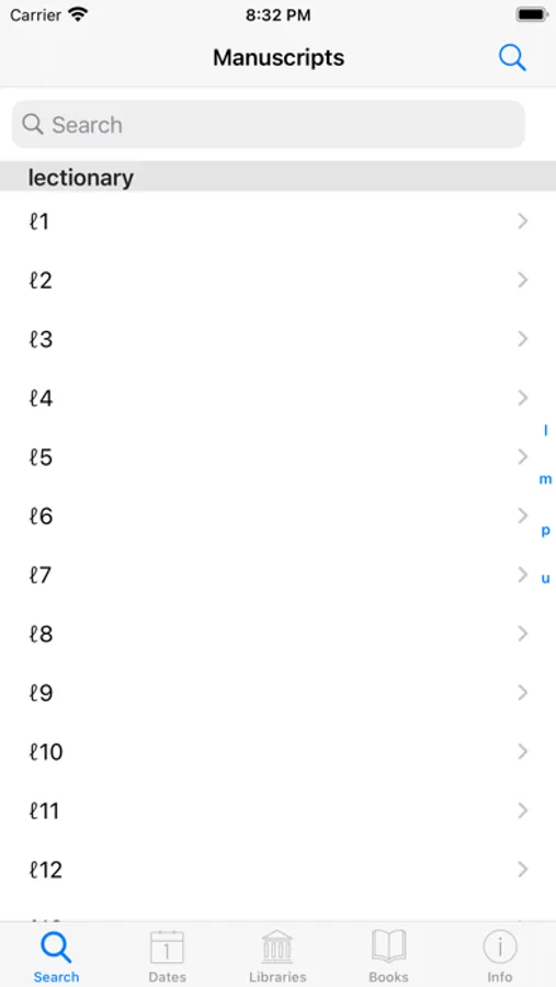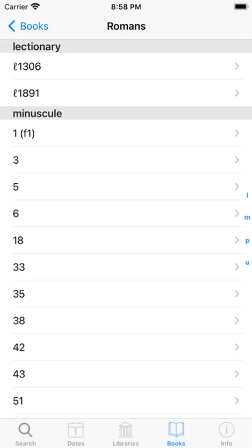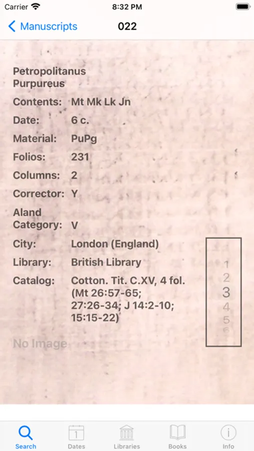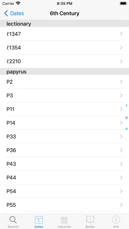 NT Greek MSS is a list of catalogued Greek Manuscripts of the New Testament. Each entry lists the basic information for the selected manuscript — ID, contents, date, material, folios, columns, lines per page, city, library, and call numbers. In addition to a searchable list of the manuscripts, three other tabs are available which group the manuscripts by Date, Library, and Books of the NT. The Date tab allows the user to choose a century and the app then lists the manuscripts which are catalogued for that century, e.g. select VI and the list will include V/VI, VI, and VI/VII century manuscripts. The Libraries tab displays a list of cities, then library (or libraries if there are more than one in the selected city), then a list of available manuscripts in the selected library with call numbers included in the manuscript description. The books of the NT tab will allow the user to choose a book of the NT and the app then lists the manuscripts which contain contents of that particular book.