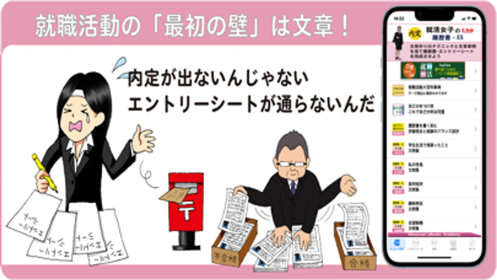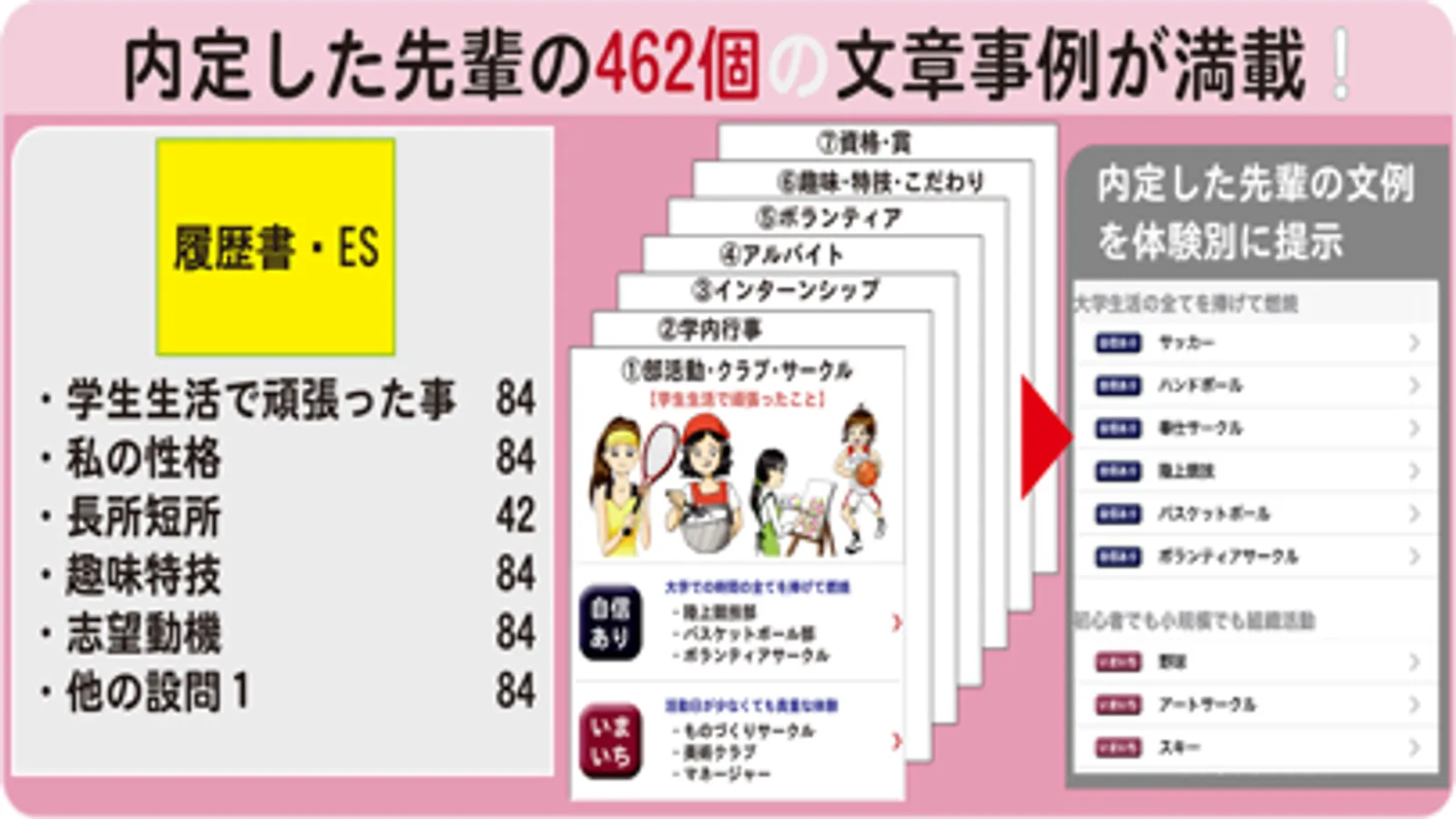 就活女子のための履歴書・エントリーシート(ES)の文例462個を収載したアプリです。