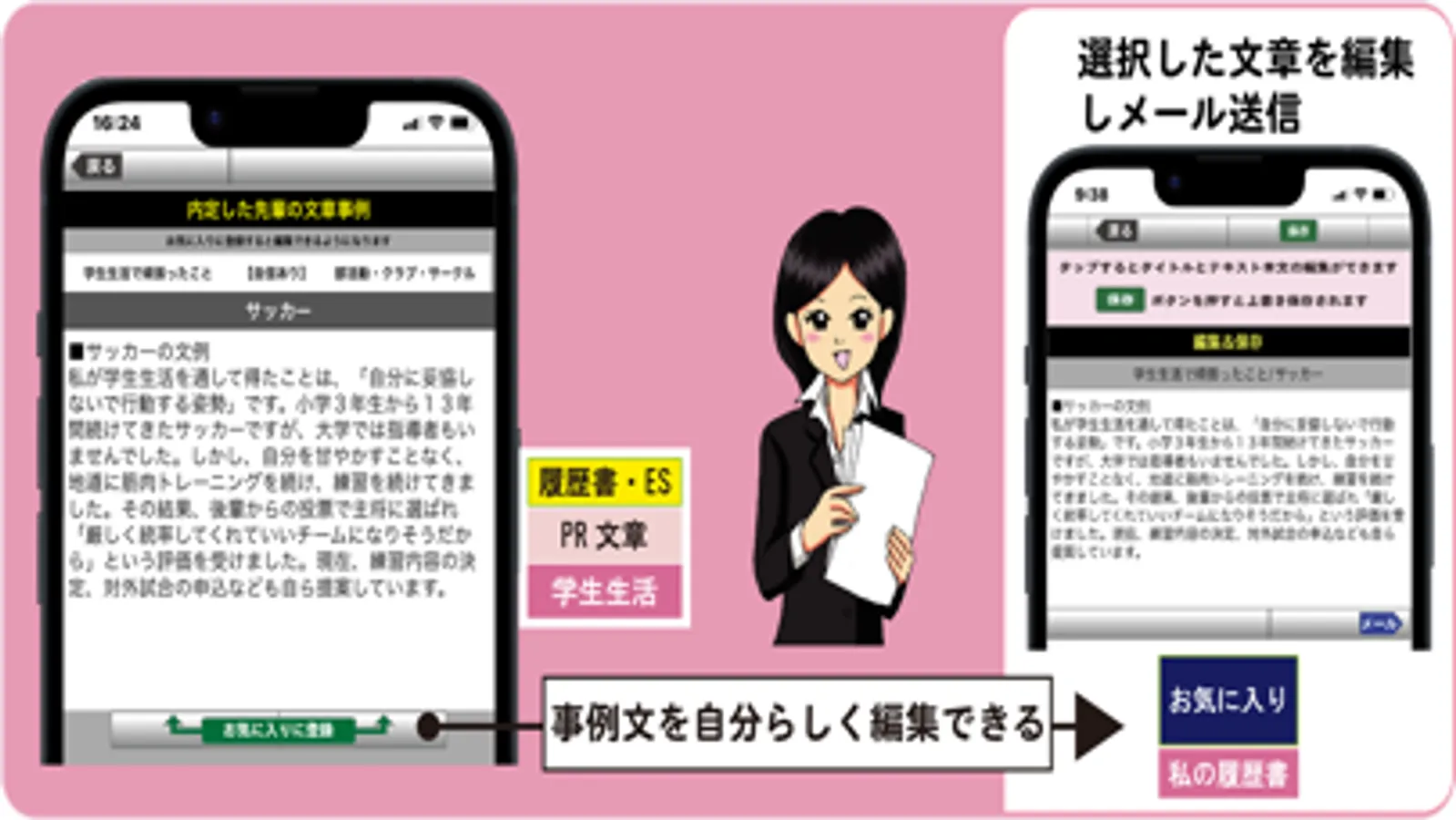 お気に入りに登録した文章を、自分に合うように編集・保存したり、メールで送ることもできます。