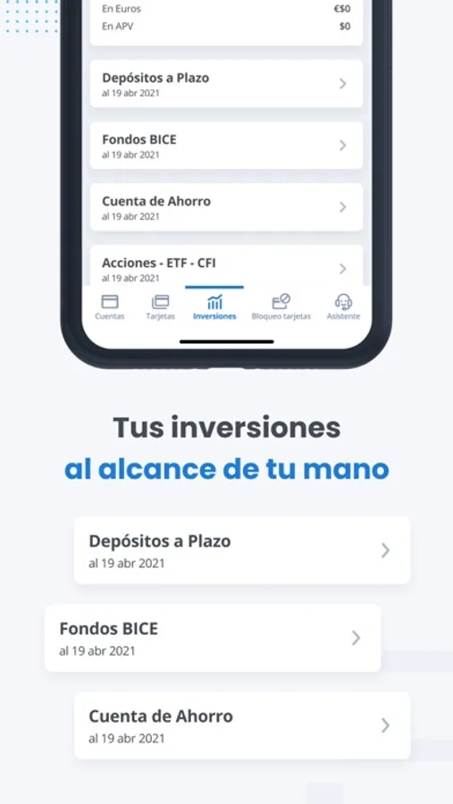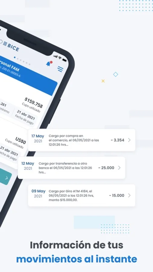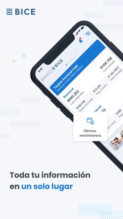 APP para clientes del banco BICE que ofrece servicios para poder manejar sus cuentas asociadas y sus respectivas tarjetas de crédito y debito, incluyendo ademas funcionalidades de productos que ofrece el banco como productos de inversiones, productos de divisas y créditos