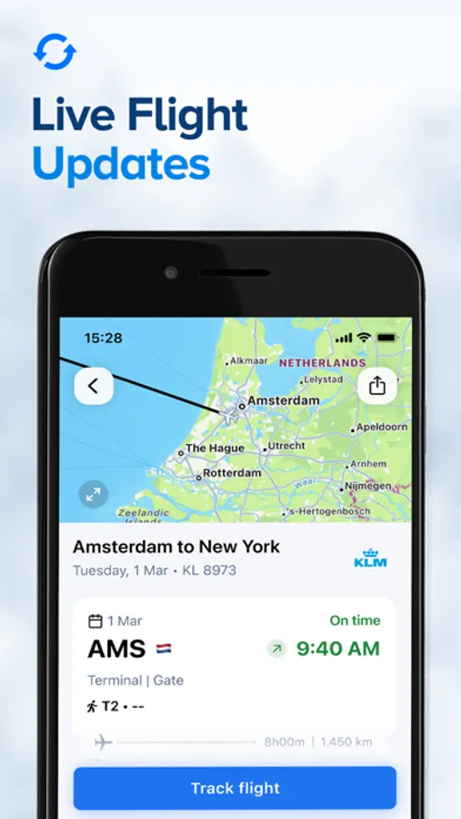 Access detailed information such as estimated time of arrival, the actual time of departure, terminal and gate number, route, distance, duration, and flight time left. The app supports over 850 airlines.