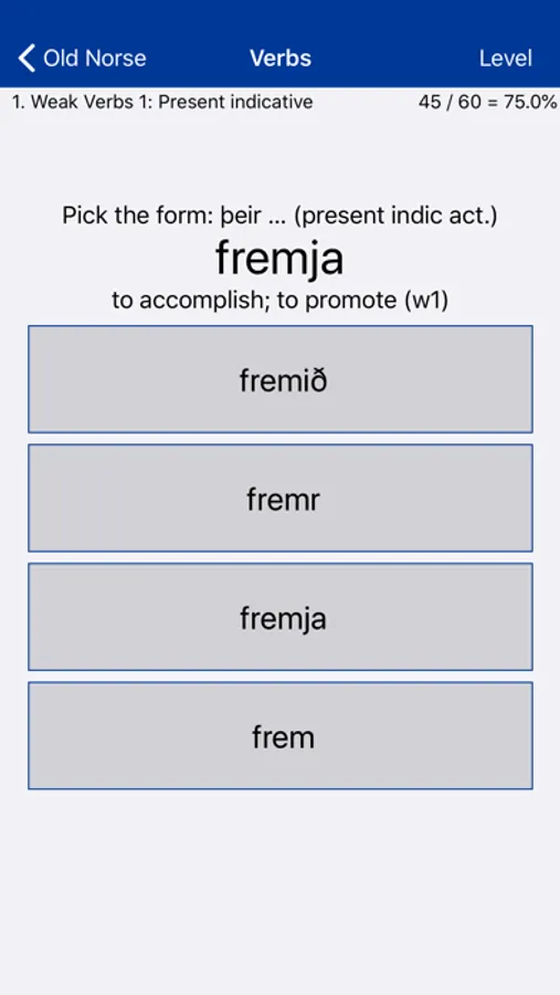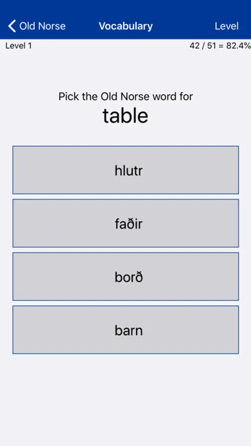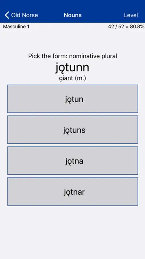 Whenever you have a moment to spare, your phone can call up a rolling multiple-choice test that helps you practise Old Norse vocabulary and grammar. Each answer you give is immediately confirmed or corrected, and your knowledge is reinforced by as much repetition as you find useful.