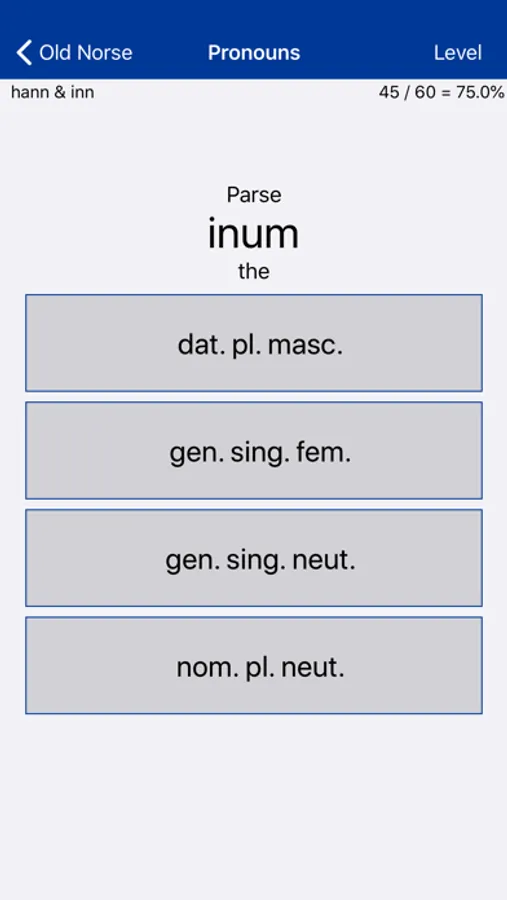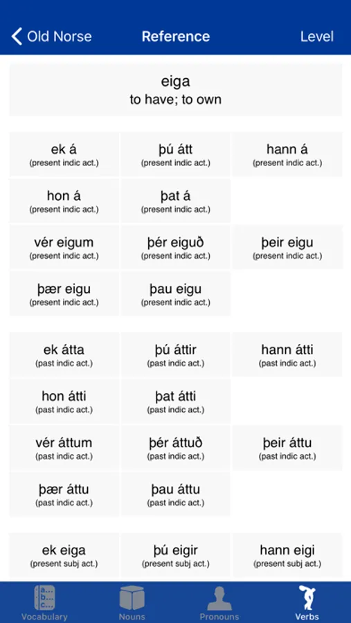 • Vocabulary: 335 levels, each testing your ability to translate ten words between English and Old Norse. Interspersed among these are cumulative levels reviewing what has been learned earlier (for a total of 377 levels).
