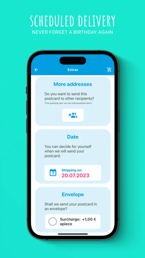 You can design postcards, close the app, and continue later. Your created postcards remain in the shopping cart until payment.