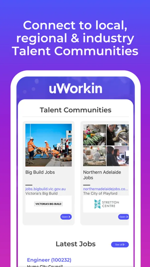 The uWorkin Jobs App connects you to local, regional, project and industry based Talent Communities so you can access exclusive employment opportunities from employers.