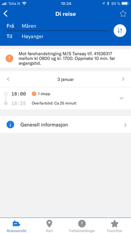 Denne appen gir informasjon om Fjord1 sine ferjeruter og trafikkmeldingar. Den er knytt mot eksisterande rutetabellar, og blir oppdatert kontinurleg. Her finn ein også prisinformasjon, kontaktinformasjon og generell informasjon om tilbuda som finst om bord. Appen passar til både pendlarar og øvrig reisande.