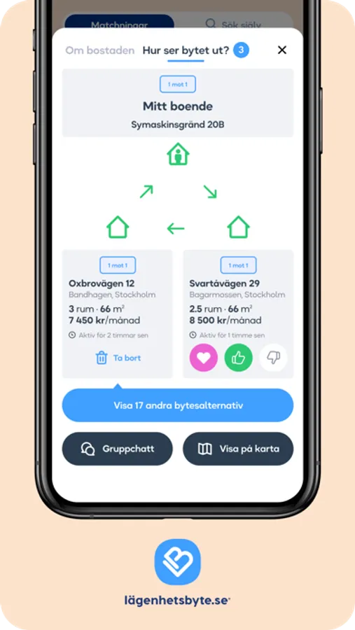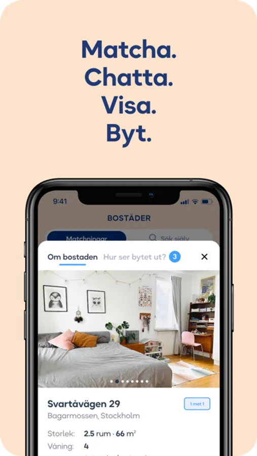 Vi matchar din nuvarande bostad med dina önskemål för ditt nästa boende och ger dig relevanta bytesförslag att ta ställning till.