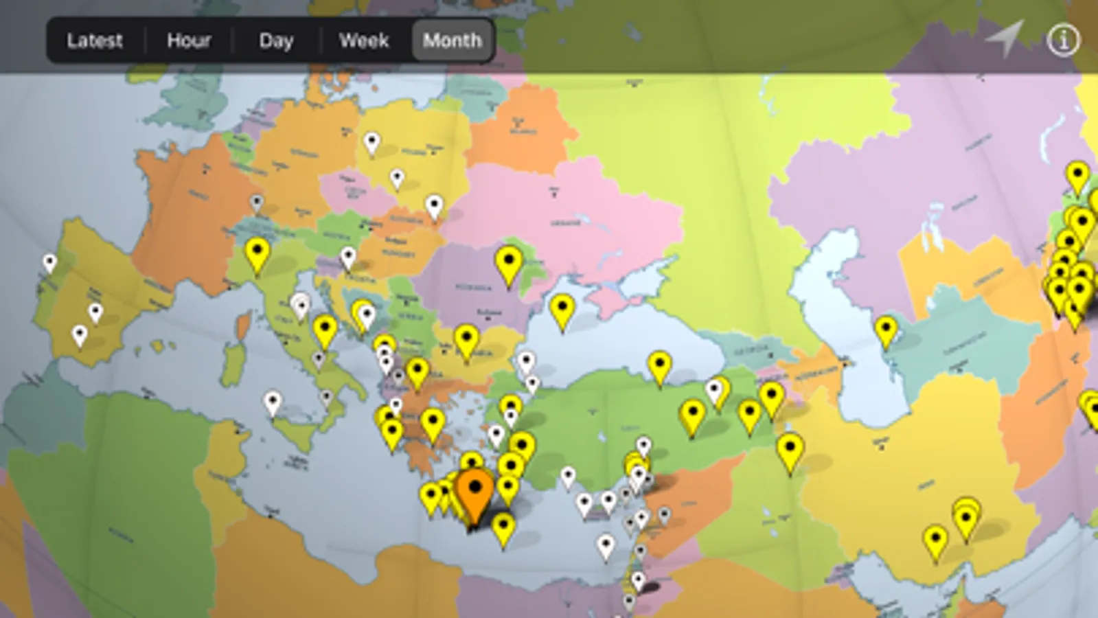 A range (latest earthquake, last hour, day, week, or month) can be selected to display earthquakes within that time frame.