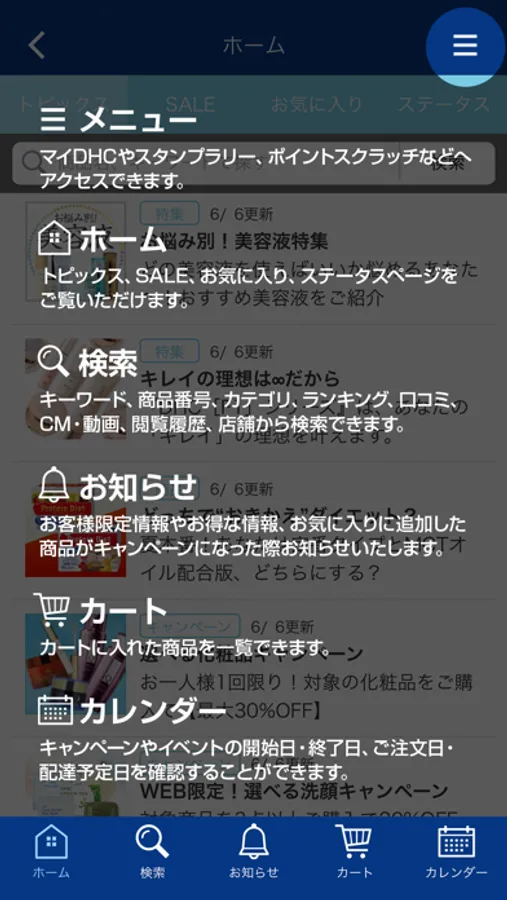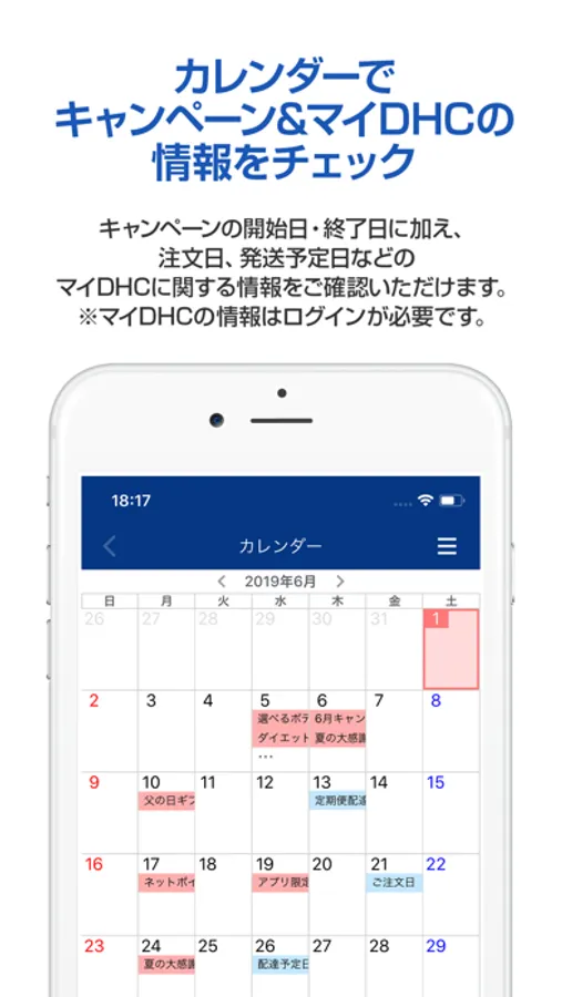 ・カレンダー機能でキャンペーンやイベントの開始日/終了日、クーポン有効期限、マイDHCの情報を一覧で見ることができます。