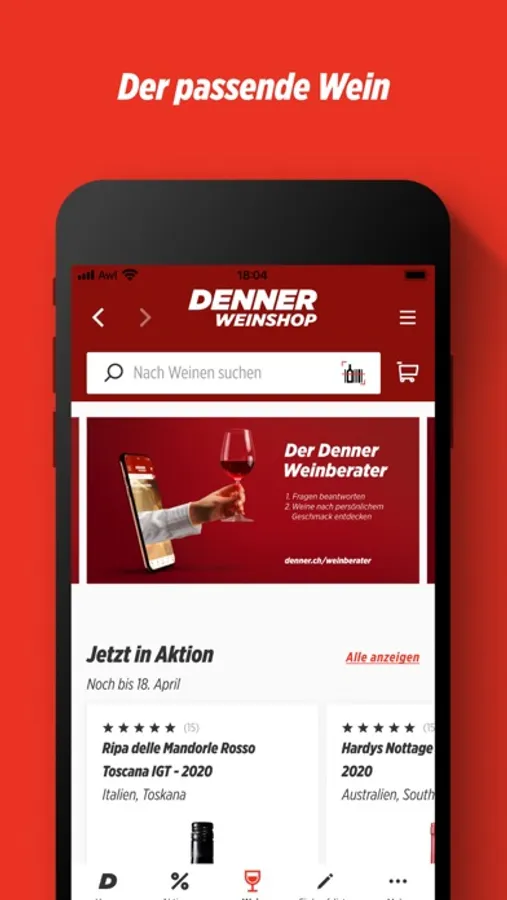 Bei der Auswahl hilft Ihnen der Denner Weinberater. Mit der Erstellung Ihres persönlichen Geschmacksprofils entdecken Sie ganz einfach die Weine, die zu Ihrem Gusto passen. Oder finden Sie den perfekten Wein für ein geplantes Essen: Mit wenigen Klicks stellen Sie Ihr Menu nach Wahl zusammen. Und schon empfiehlt Ihnen unser Online-Weinberater die passenden Denner Weine.