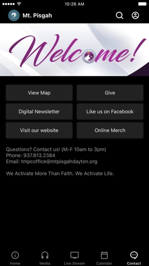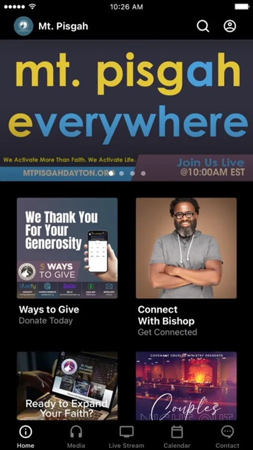 Welcome to the official Mount Pisgah Church application. We are a progressive ministry located in Dayton, OH and we guarantee that as you navigate within our App you will embody the momentum of Mount Pisgah's culture which encourages all to Enjoy Family, Expand Your Faith, Encounter Freedom, and Enhance Your Focus.