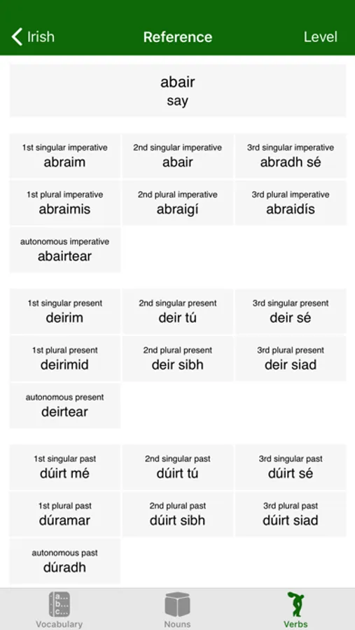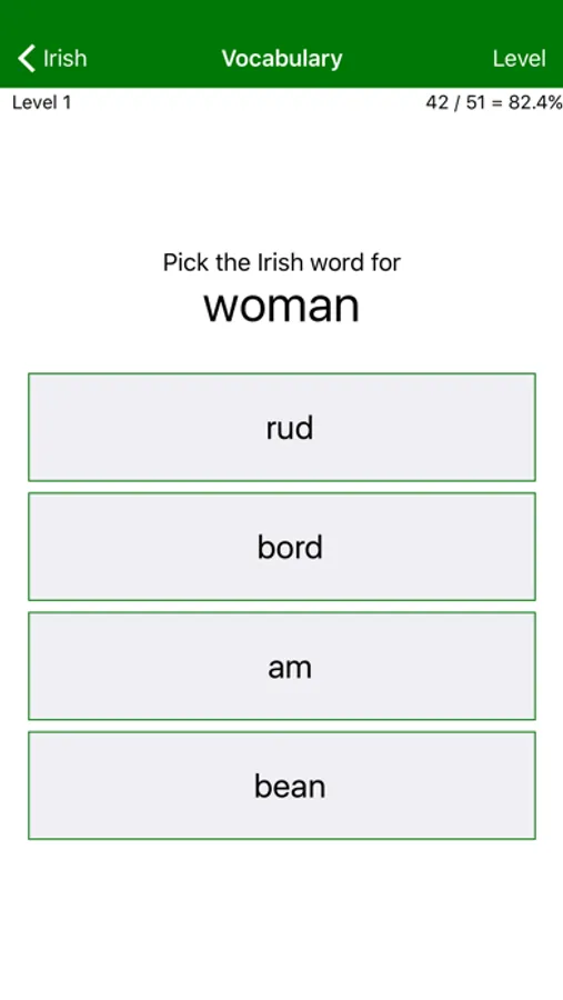 • Vocabulary: 450 levels, each testing the translation of 10 words between Irish and English. Interspersed among these are cumulative levels reviewing what has been learned earlier (for a total of 506 levels).