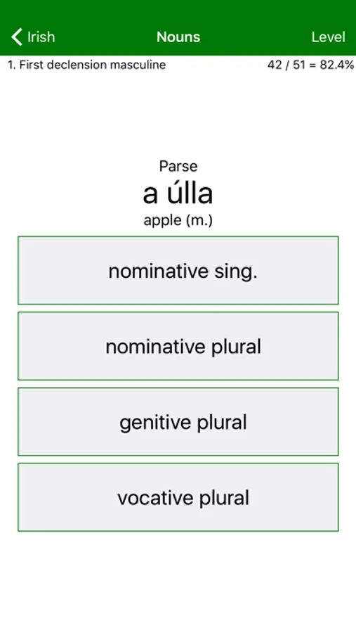 • Nouns: Tests your ability to parse and decline all types of Irish nouns.