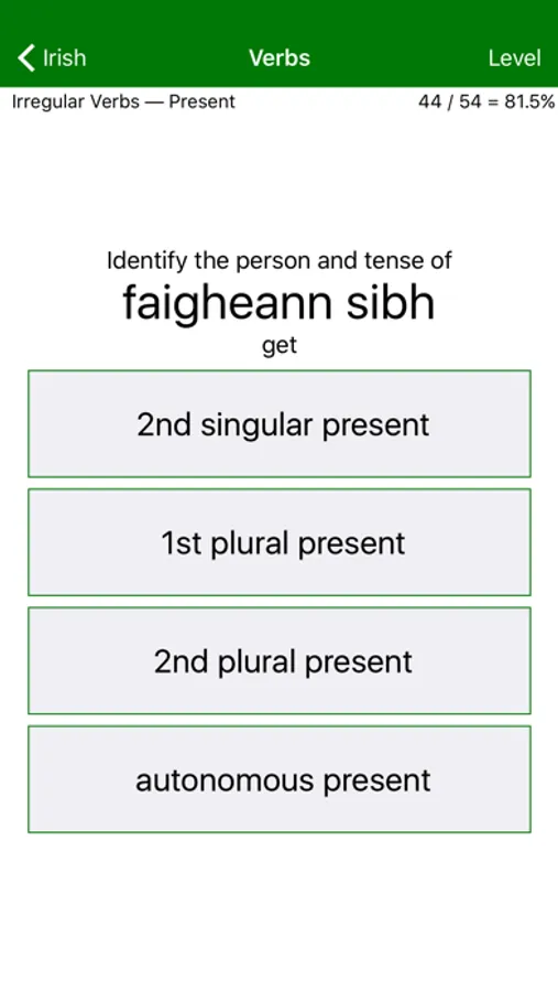 • Verbs: Tests your ability to parse and conjugate all classes of regular and irregular Irish verbs.