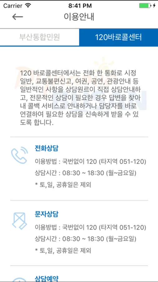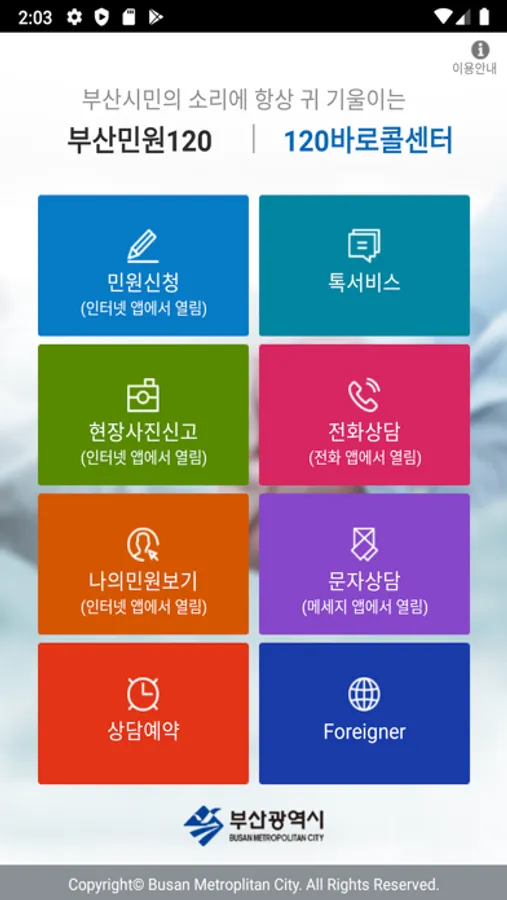 부산에 관한 문의사항이 있을 때는 120바로콜센터 모바일앱으로 상담신청하여 주십시오.