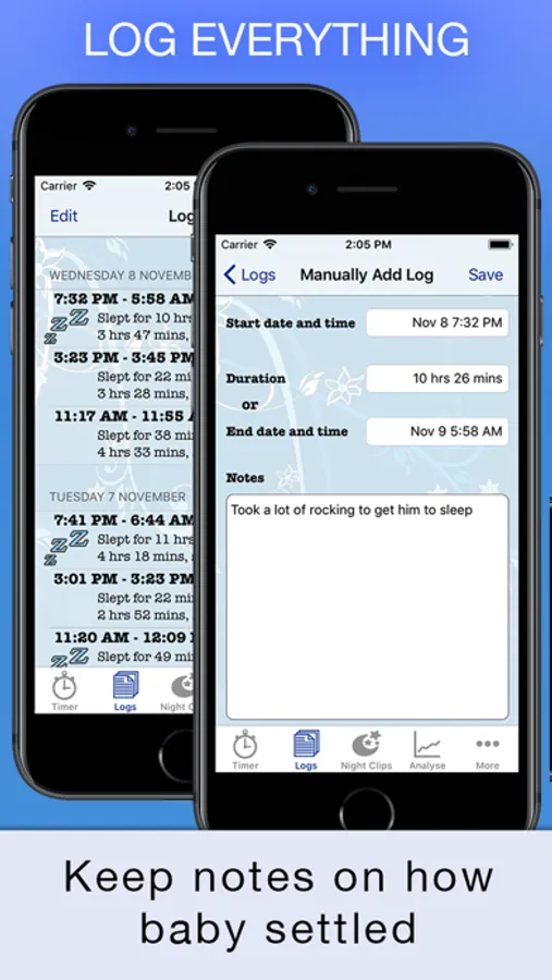 + Record notes detailing where baby went to sleep, and how long it took to settle them.