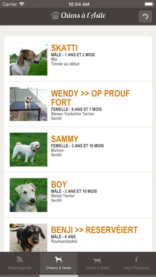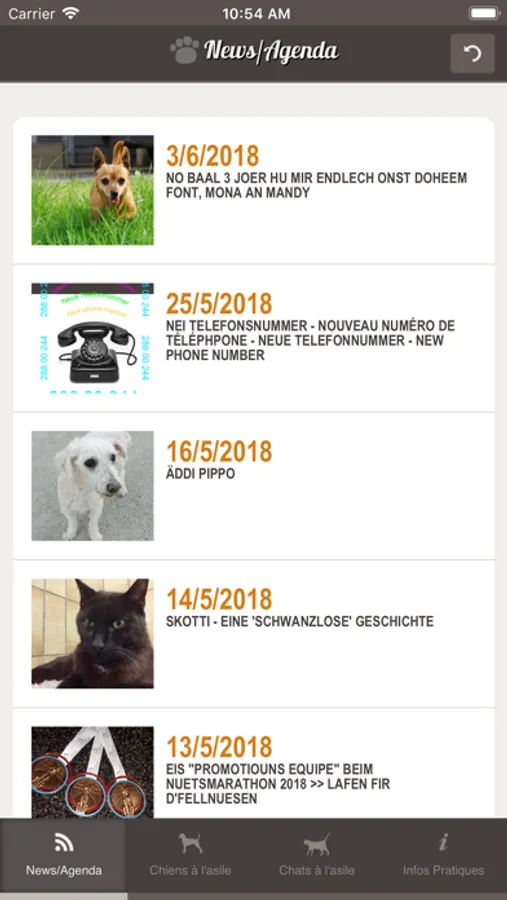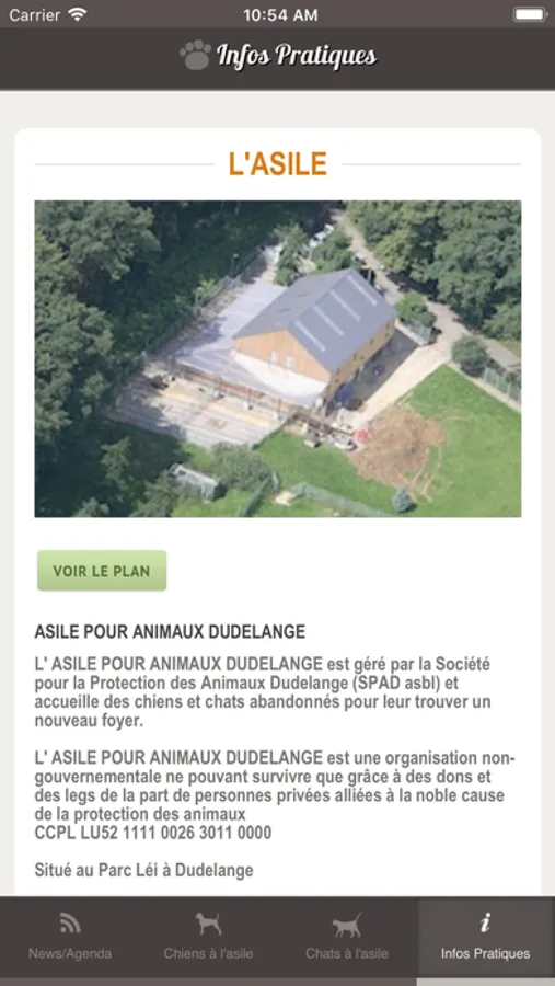 Avec l'application iPhone de l'asile pour animaux de Dudelange, adoptez d'urgence l'outil interactif de tous ceux qui aiment les animaux au Luxembourg. Il vous permettra de retrouver l'ensemble des chats et des chiens à adopter mais également de consulter les dernières activités du centre et toutes les informations pratiques.